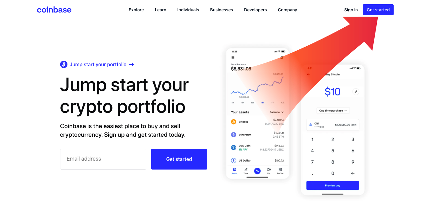 Börja med att gå till Coinbase hemsida eller följ den här länken och klicka på knappen ”Get started”.