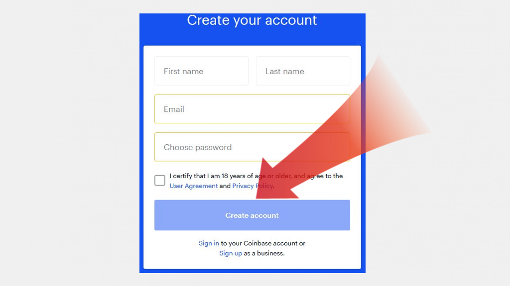 Nästa steg är att fylla i din e-postadress för att kunna logga in på Coinbase. Fyll i ditt namn, efternamn, e-postadress och välj ett lösenord.