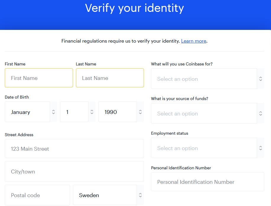 Coinbase kräver en verifiering av personuppgifter av alla kunder. Det gnomförs direkt i registreringsprocessen. Där fyller man i personuppgifter och laddar upp en kopia på sitt ID-kort. Vanligtvis godkänns verifieringen på ett dygn varpå handel kan ske.