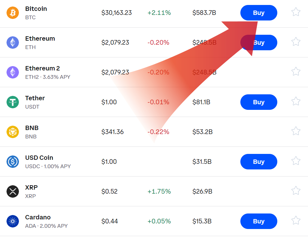 För att köpa bitcoin trycker du på “Trade” i navigeringsmenyn. Därefter kommer en detaljerad lista på tillgängliga kryptovalutor att visas med deras aktuella pris och kursförändring de senaste 24 timmarna. Välj bitcoin genom att klicka på “Buy”. Välj hur stor summa du vill köpa för.