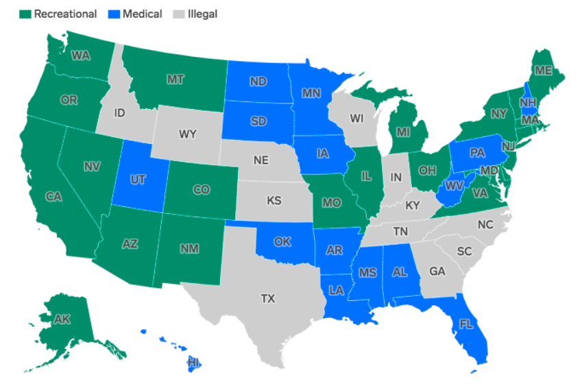 I exempelvis USA finns de flera stater där cannabis är tillåtet, exempelvis Colorado. Man väntar dock på klartecken från FDA (U.S. Food & Drug Administration) på att cannabis ska bli helt legaliserat över hela landet.