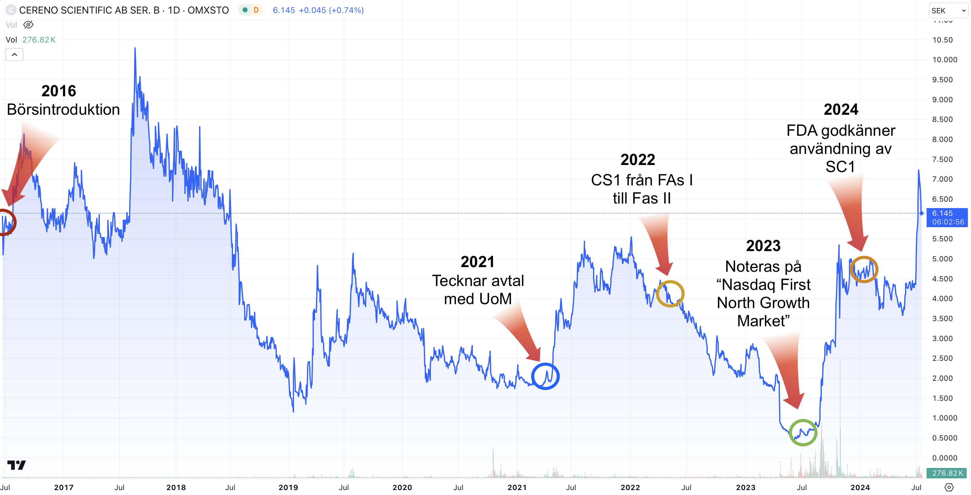 Ovan visas Cereno Scientifics aktiekursutveckling mellan 2016 och 2024 och exempel på viktiga bolagshändelser. Som ett exempel blev deras läkemedelskandidat, SC1, godkänt av FDA för användning på allvarligt sjuka patienter, i början av år 2024. Läs mer i kapitel 2.
