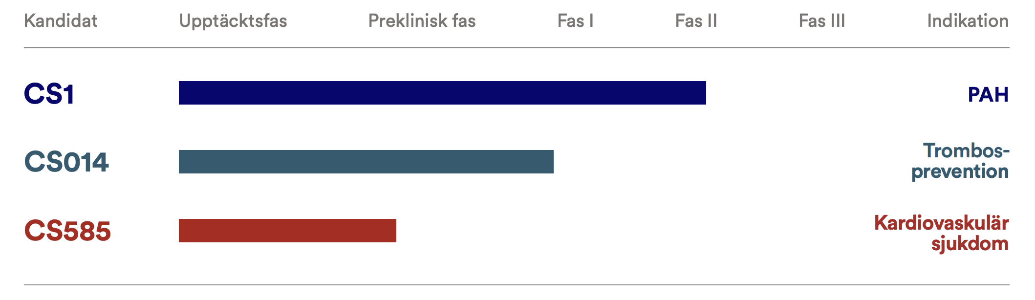 Bilden ovan visar i vilka faser som bolagets läkemedelskandidater befinner sig inom. Längst på vägen har läkemedlet CS1 kommit som befinner sig i Fas II. Det betyder att läkemedlet precis börjat användas på en större grupp patienter, för att upptäcka potentiella biverkningar. Läs mer i kapitel 3.