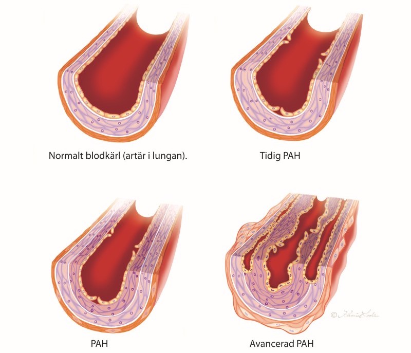 Bilden nedan visar hur ett normalt blodkärl ser ut i jämförelse med avancerad PAH.