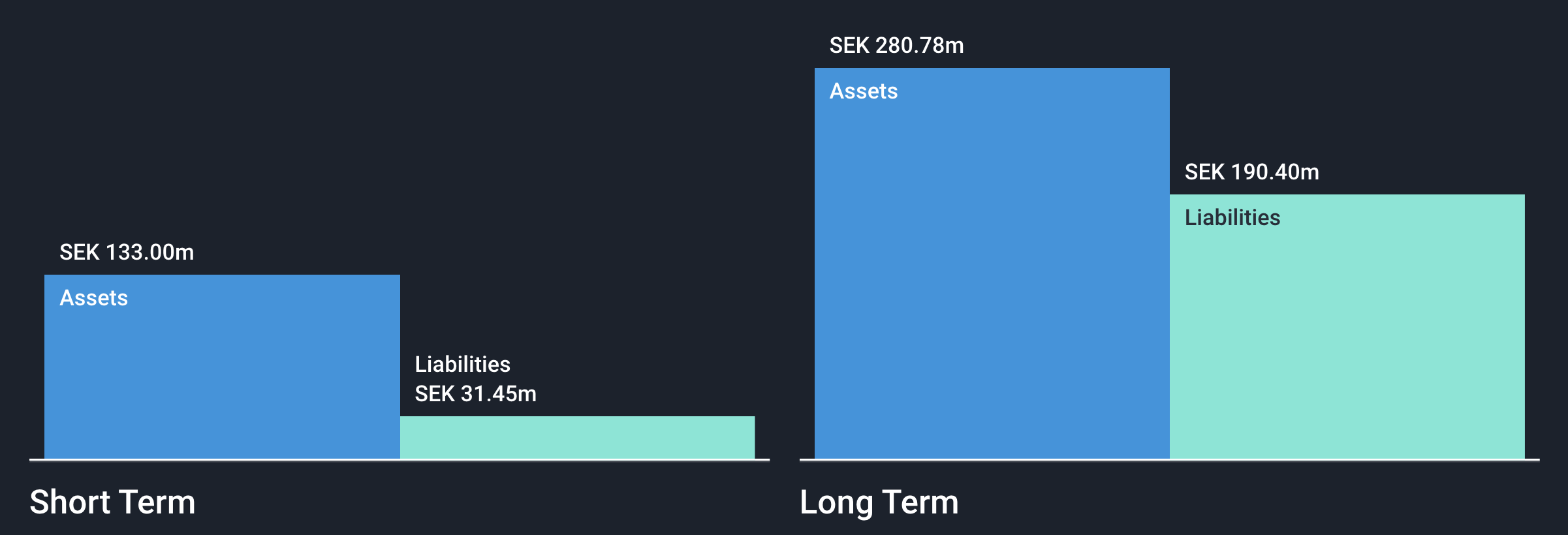 Bolagets skulder uppgick till totalt 221,85 Mkr. Det bestod främst av skulder till kreditinstitut. Bolagets eget kapital, som är en skuld till bolagets aktieägare, uppgick till totalt 191,93 Mkr.