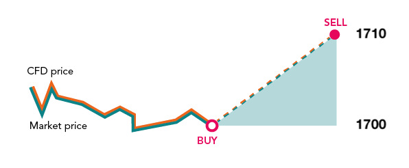 - Öppna en köp-position i CFD – När du tror att kursen för en underliggande tillgången kommer att stiga så köper du CFD:s. För att realisera din vinst så säljer du lika många kontrakt som du angav när du tog din köp-position.