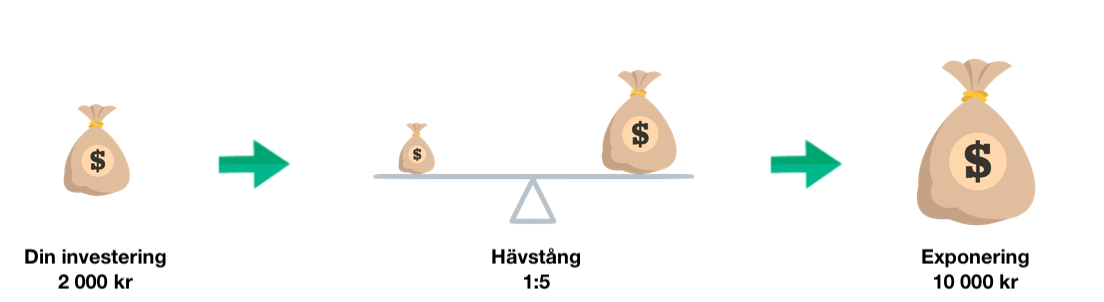 CFD:s är en hävstångsprodukt. Det betyder att du inte behöver ha tillgång till hela kapitalet som krävs för att öppna en position. Hävstångshandel betyder alltså att du kan få stor exponering med ett relativt litet investerat belopp.