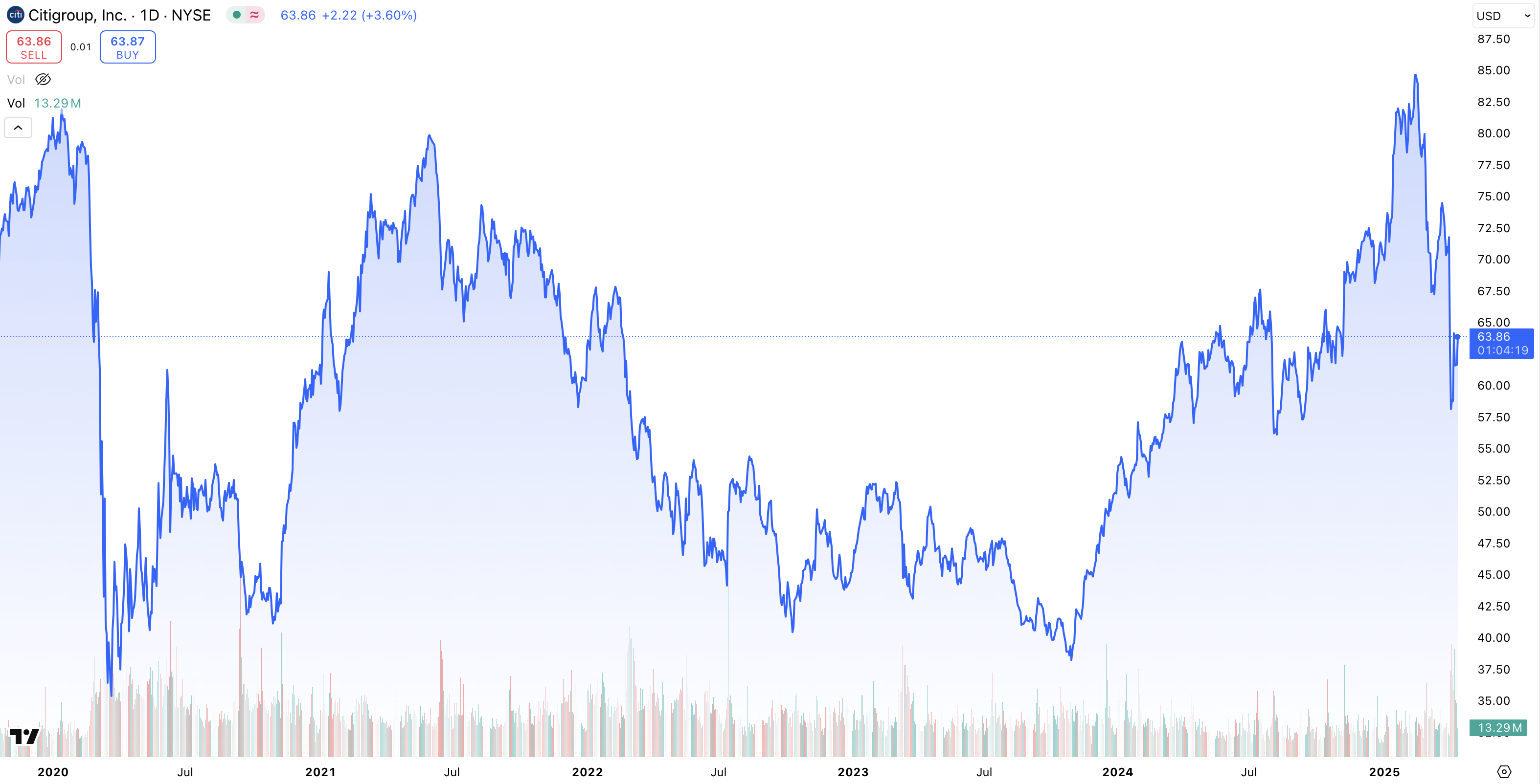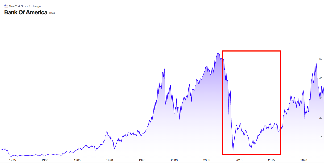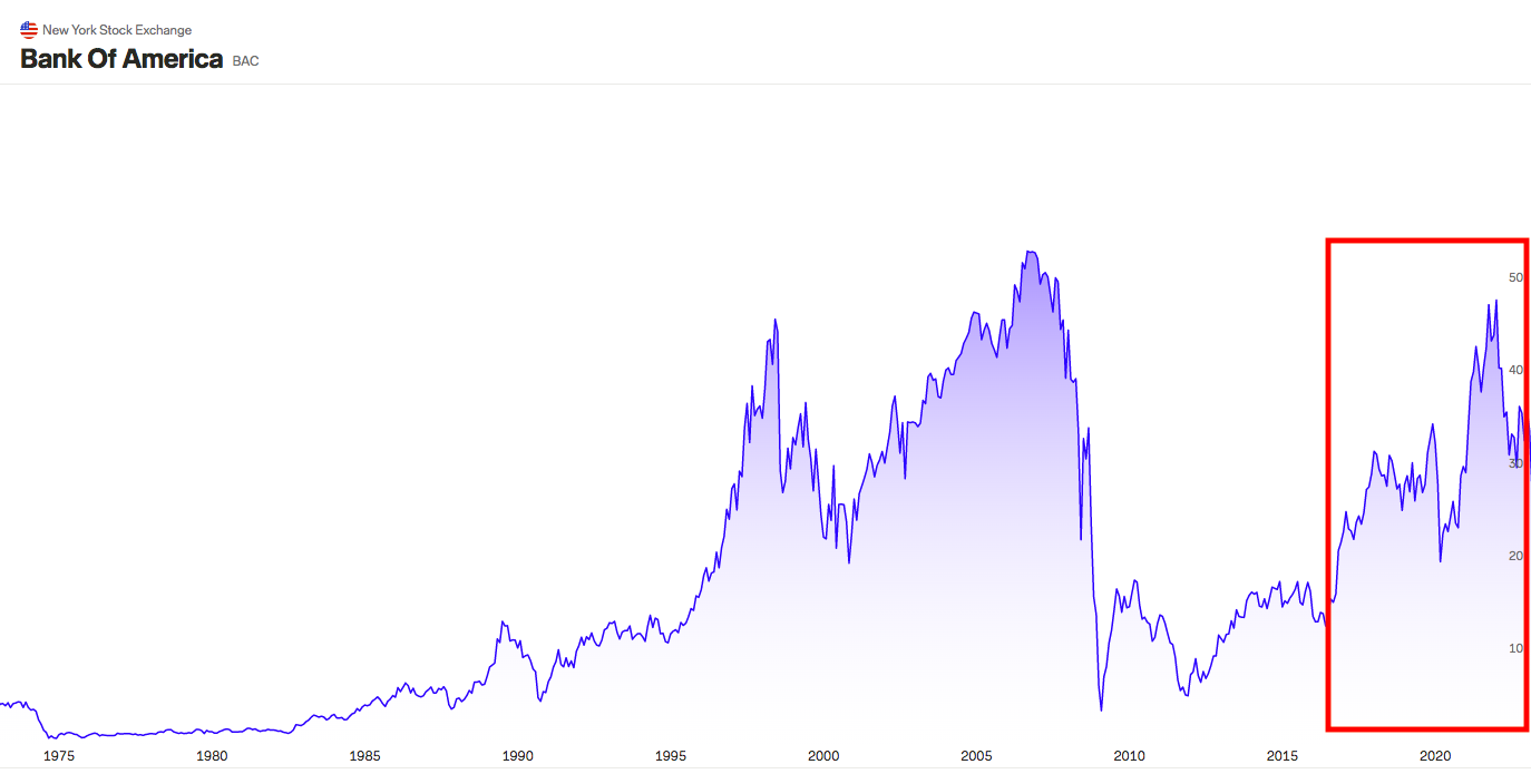 Bank of Americas aktiekurs, 1973 – 2022: