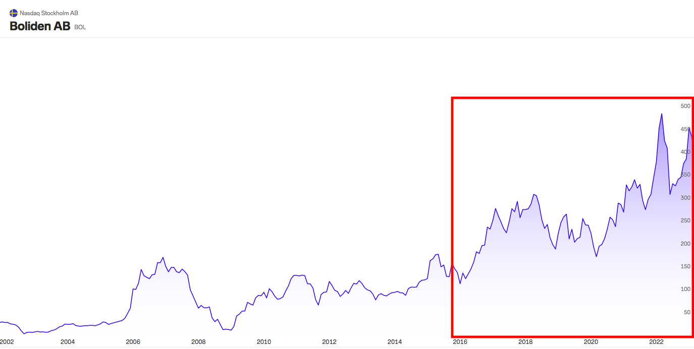 (Bildkälla: Nordnet – Bild B, Bolidens aktiekurs mellan 2000 och 2022)