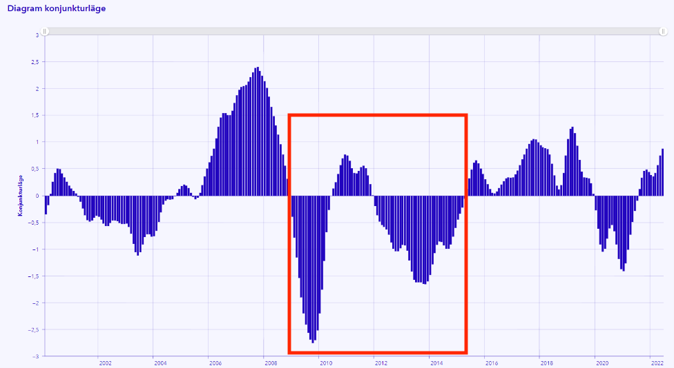 I grafen nedan ser vi hur det rådde en lågkonjunktur mellan 2008 och 2015 (se “Bild A”). Det bidrog till en mycket tuff ekonomisk period för cykliska bolag. Ett av de mest drabbade branscherna var råvaruindustrin.