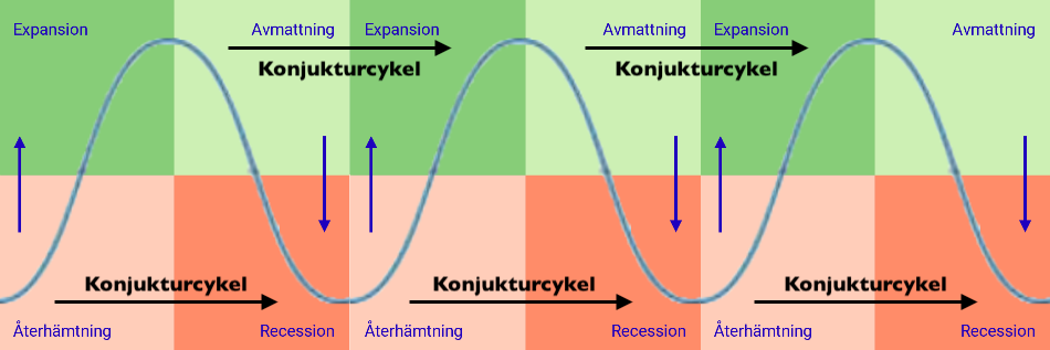 Sätter man ihop begreppen ovan får man något som man talar ofta om inom ekonomin, nämligen konjunkturcykler. En konjunkturcykel kan representera en konjunkturtopp till nästa topp, alternativt en konjunkturbotten till nästa botten, som bilden nedan visar.