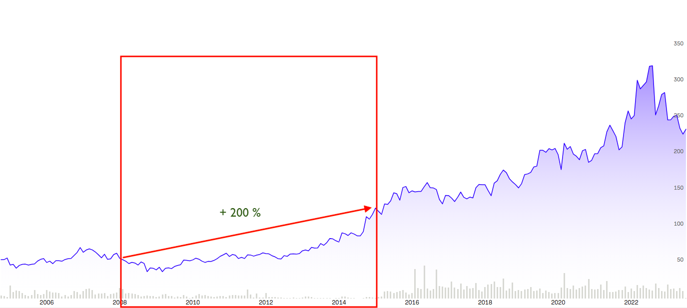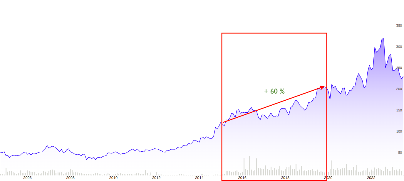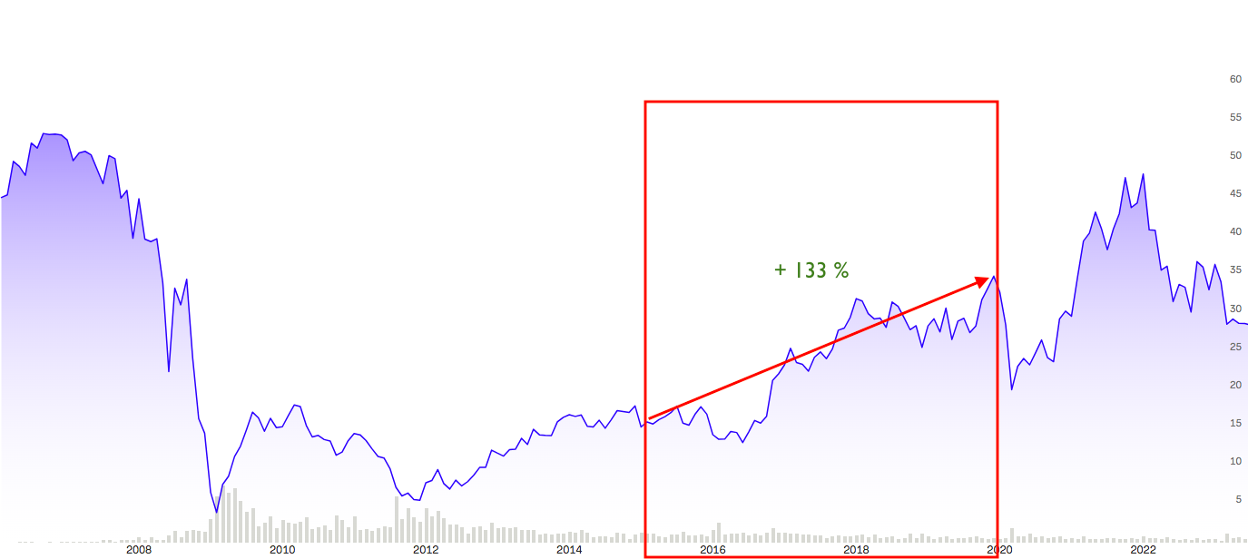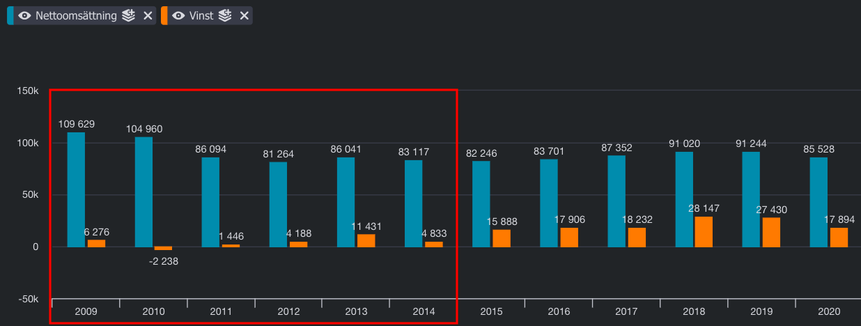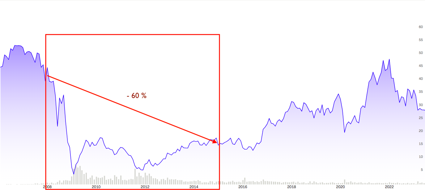 Aktiekursen sjönk under perioden med cirka 60 %. En mycket dålig utveckling med tanke på att S&P 500 index gav en positiv avkastning på nästan 60 % under samma period.