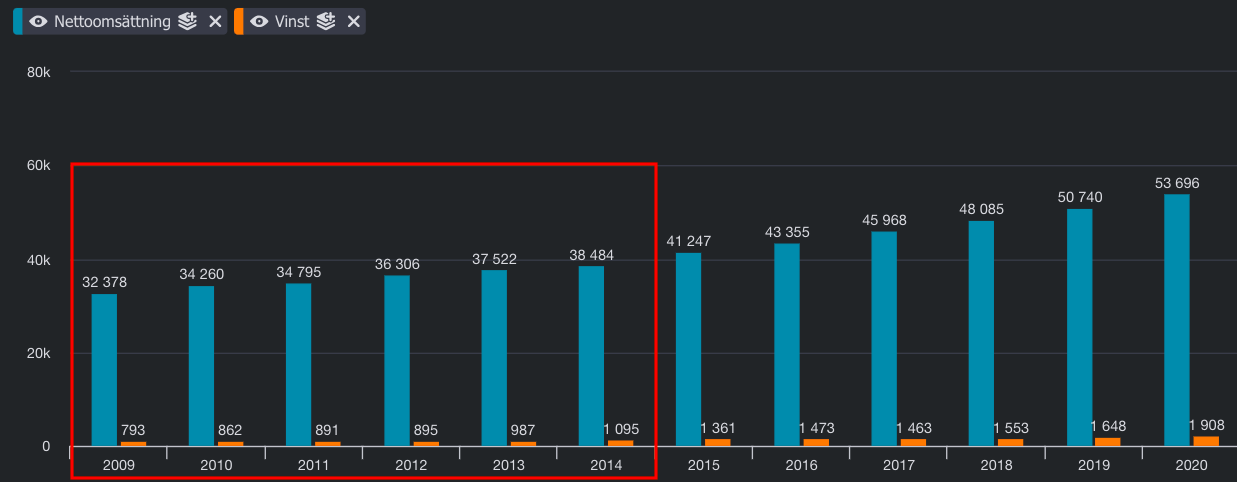 Desto bättre gick det för Axfood som, trots lågkonjunkturen, lyckades öka både omsättning och vinst för perioden 2008/2009 fram till 2015. Den fortsatt starka tillväxten, i kombination med att investerare valde att spara i stabilare aktier, ledde till denna positiva kursutveckling.