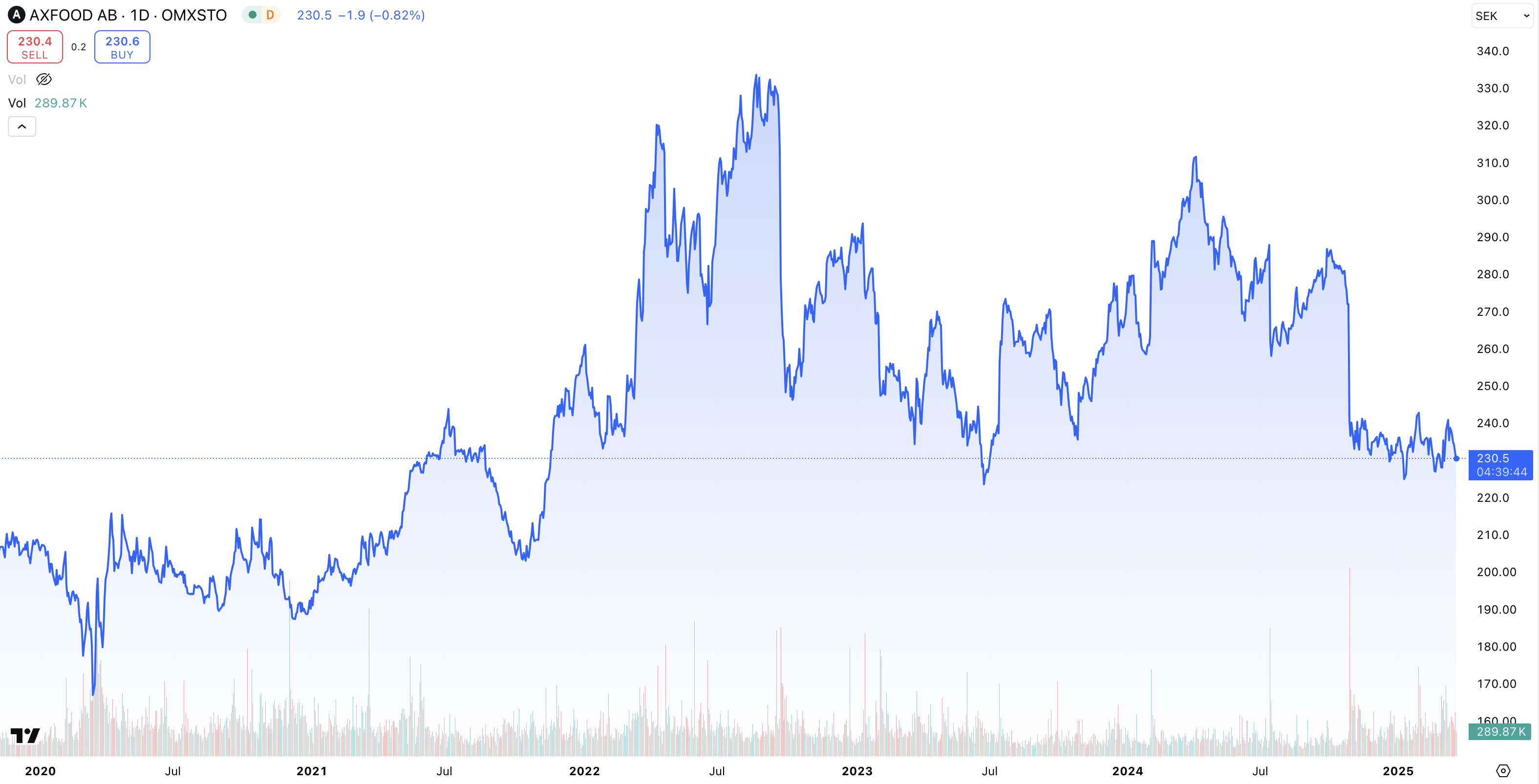 Totalt ökade Axfoods aktie med nästan 200 %. Under samma period gav OMXS30 index en avkastning på lite mer än 86 %. En stor skillnad inom loppet av 5 år.
