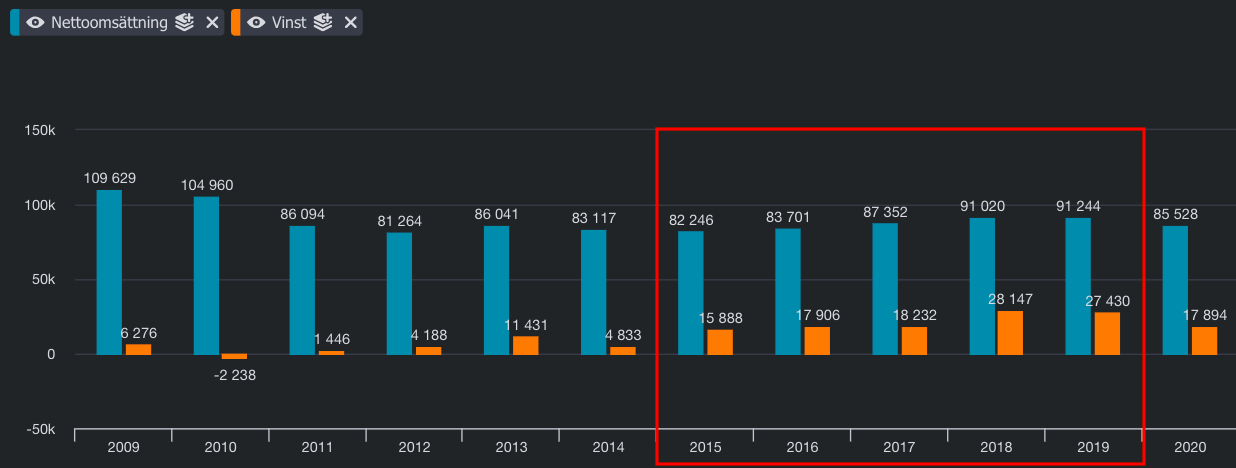 Bilden nedan visar hur Bank of Americas omsättning och vinst ökat markant från 2015 fram till 2020. Perioden är markerad med röd färg och visar hur omsättning och vinst ökade med cirka 11 %, respektive 73 %.