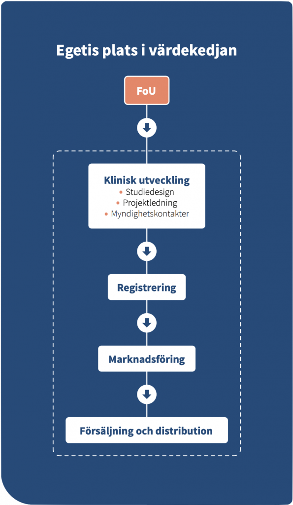 Bilden nedan visar planen i bildligt format, från FoU (forskning och utveckling) till försäljning och distribution. Egetis hoppas att Emcitate och Aladote ska vara redo för kommersialisering 2025 respektive 2026.