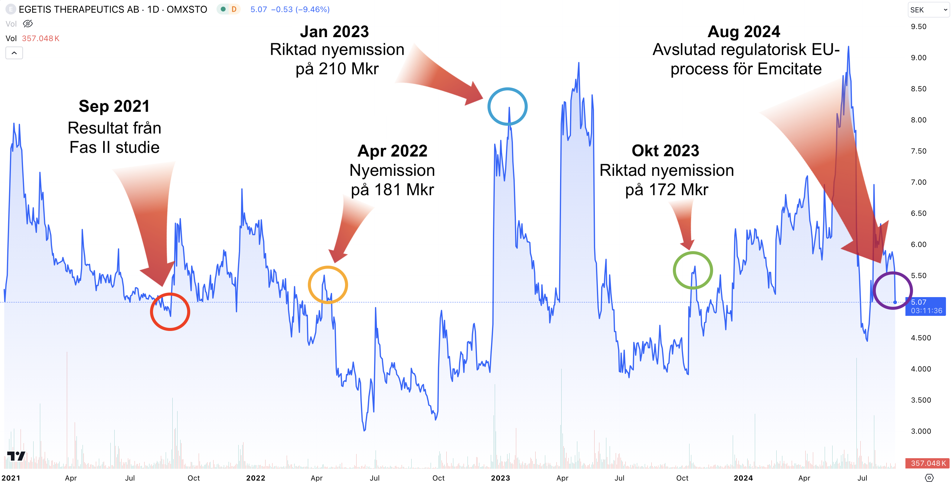 Grafen ovan visar på Egetis Therapeutics aktiekursutveckling mellan 2021 och 2024. Markerat i bilden finns även nyckelhändelser som haft en betydande inverkan på både verksamheten och aktiekursen. Läs mer i kapitel 1.