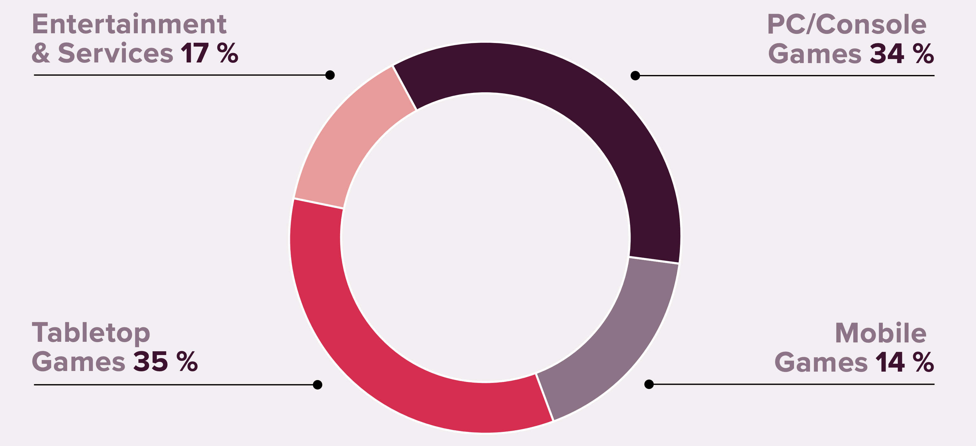 - Tabletop Games – Detta segment genererar störst andel av de totala intäkterna på 35 %. Ökningen uppgick till 13 % på helårs basis, vilket primärt drivits av samlarkortspel och produkter som Star Wars Unlimited och Ticket to Ride.