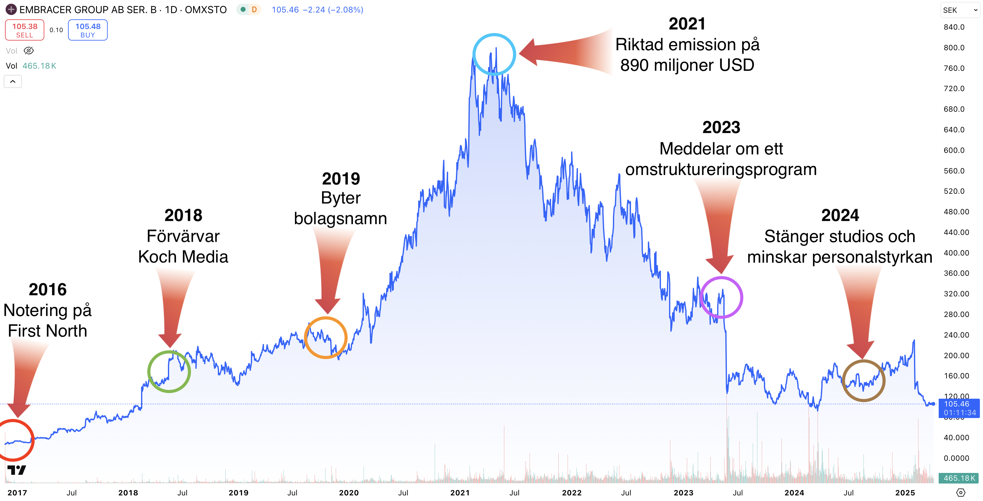 Detta kapitel ger en sammanfattning av Embracers aktiekurs mellan åren 2016 och 2025. Grafen nedan lyfter fram 6 avgörande händelser som påverkat bolagets prestation och kursutveckling. Detaljerad information om dessa händelser går att läsa längre ner efter grafen.