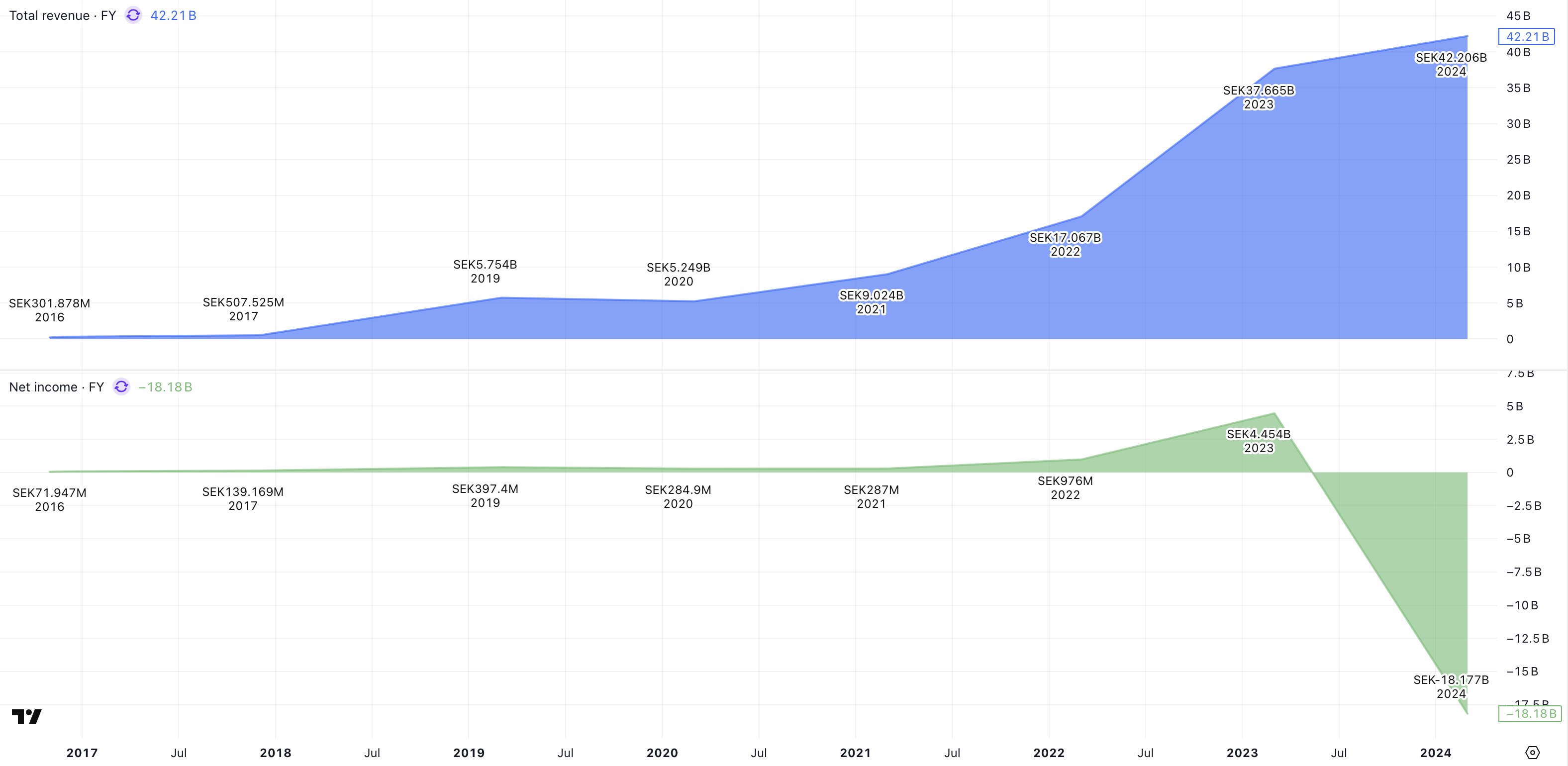 År 2016 redovisade Embracer en omsättning på 302 miljoner kronor. År 2024 uppgick den till 42,20 miljarder kronor. Det är lika med en ackumulerad genomsnittlig tillväxt på strax över 100 % per år.