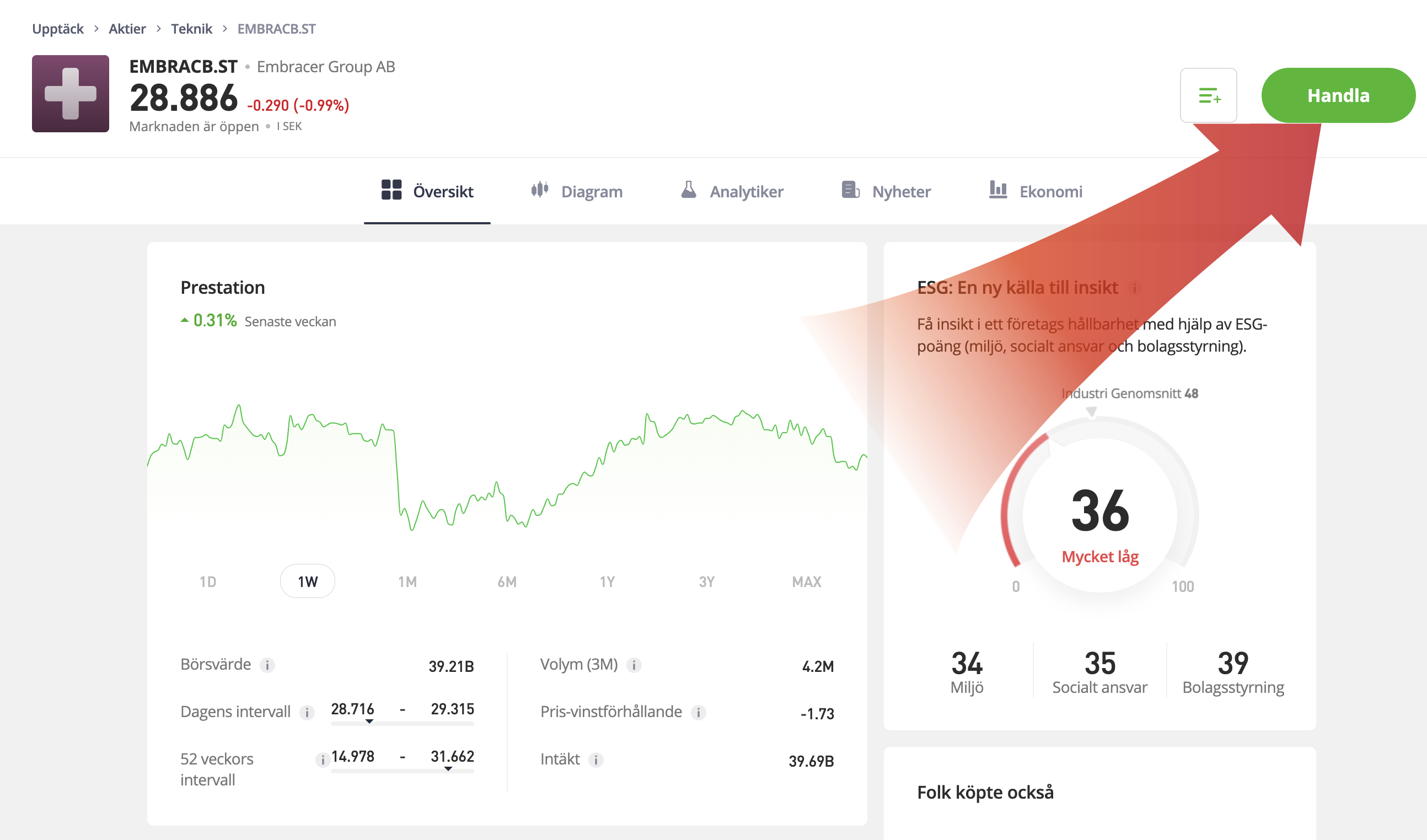 Embracer kan handlas hos både eToro och Avanza. Bolagets aktie “EMBRAC B” finns noterat på Stockholmsbörsen under kategorin “Large Cap”. Längre ner i denna guide visar vi steg-för-steg hur du handlar aktier i bolaget på 5 minuter. Läs mer i kapitel 5.