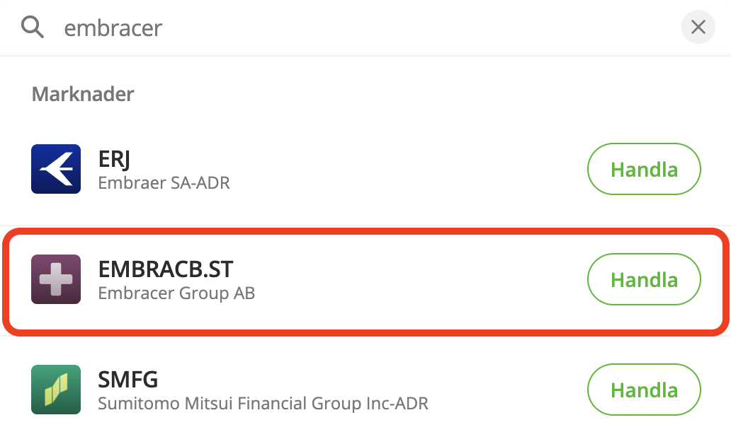 Har du pengar på ditt konto? Då klickar vi på sökknappen, söker och väljer Embracers aktie.