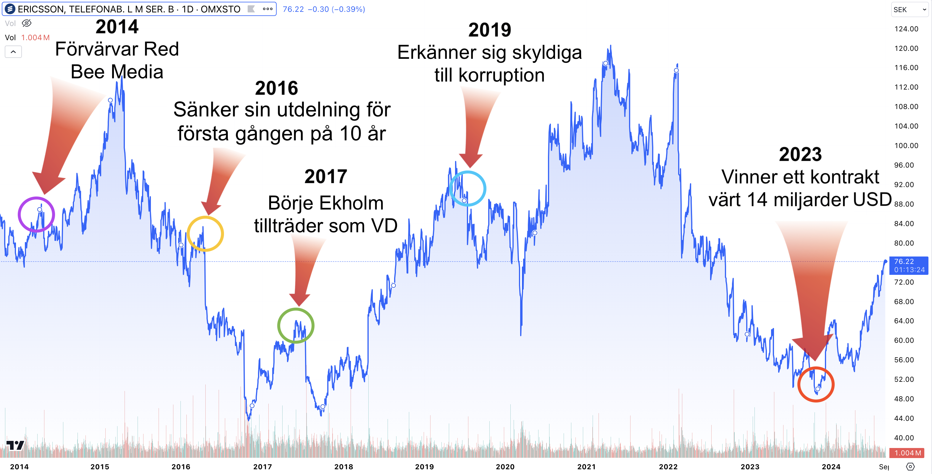 Det här kapitlet visar en sammanfattning av Ericssons aktiekursutveckling under åren 2014 till 2024. I diagrammet nedan visas dessutom 5 betydande händelser som har haft en betydande inverkan på bolagets verksamhet och aktiekurs. Mer detaljerad information om dessa händelser finns att läsa längre ner under grafen.