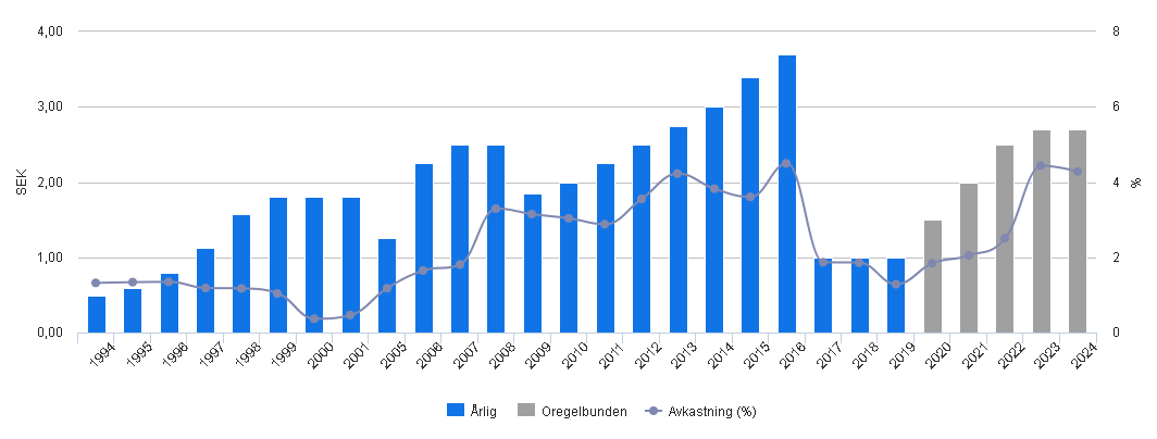 Bilden ovan visar på Ericssons utdelningshistorik. Staplarna visar utdelningen per aktie per år i svenska kronor (SEK). Det går att se hur utdelning per aktie var stigande ända fram till år 2017. Den sjönk då med 73 %, från 3.70 kr till 1.00 kr, på grund av kraftigt försämrat vinstresultat. Läs mer i kapitel 4.