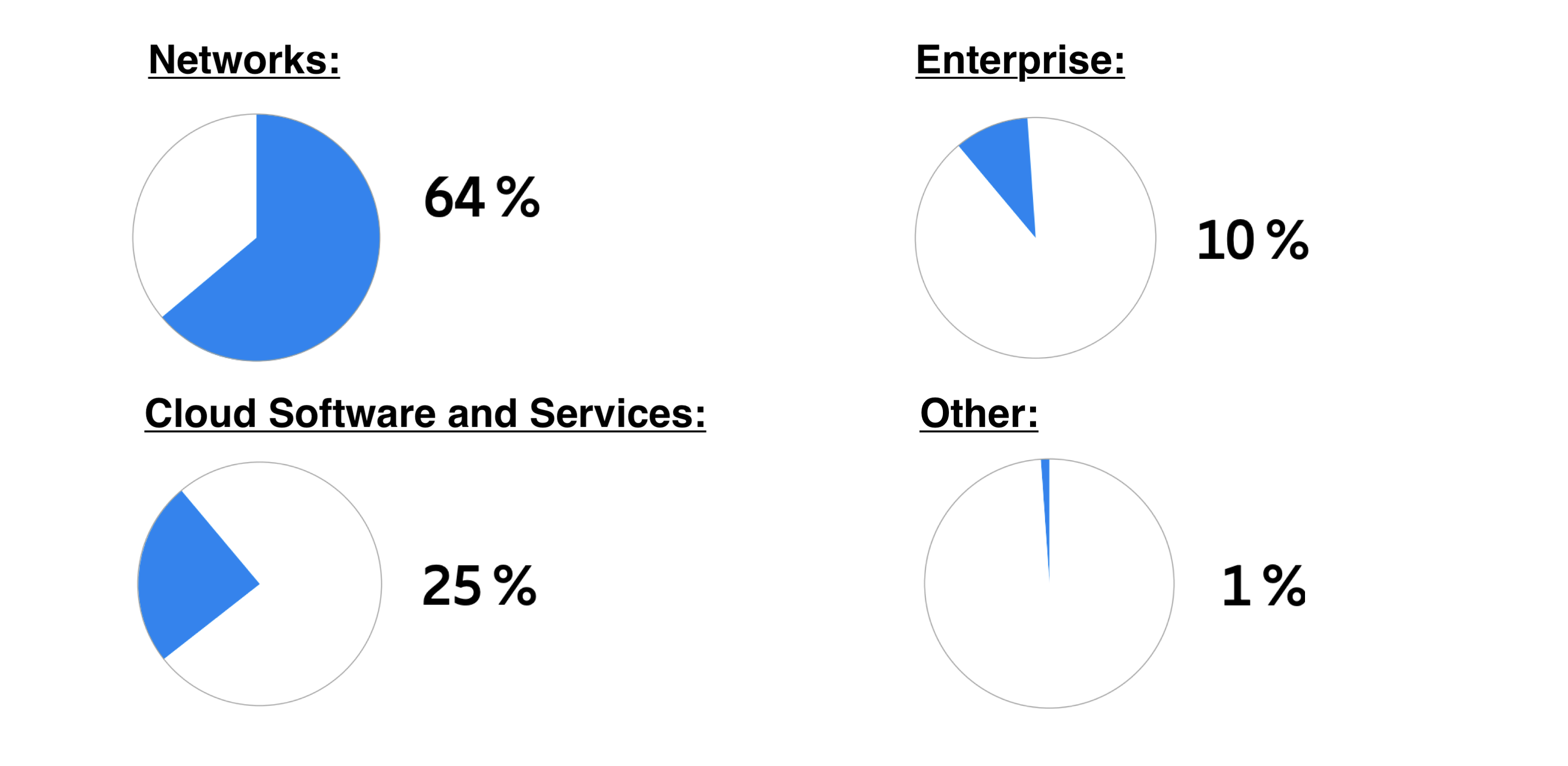 Det går tydligt att se hur intäkter från “Networks” utgör störst andel på hela 64 % av den totala omsättningen. Det näst största segmentet utgörs av “Cloud Software and Services” på 25 %, följt av “Enterprise” på 10 % och slutligen “Other” på ynka 1 %.