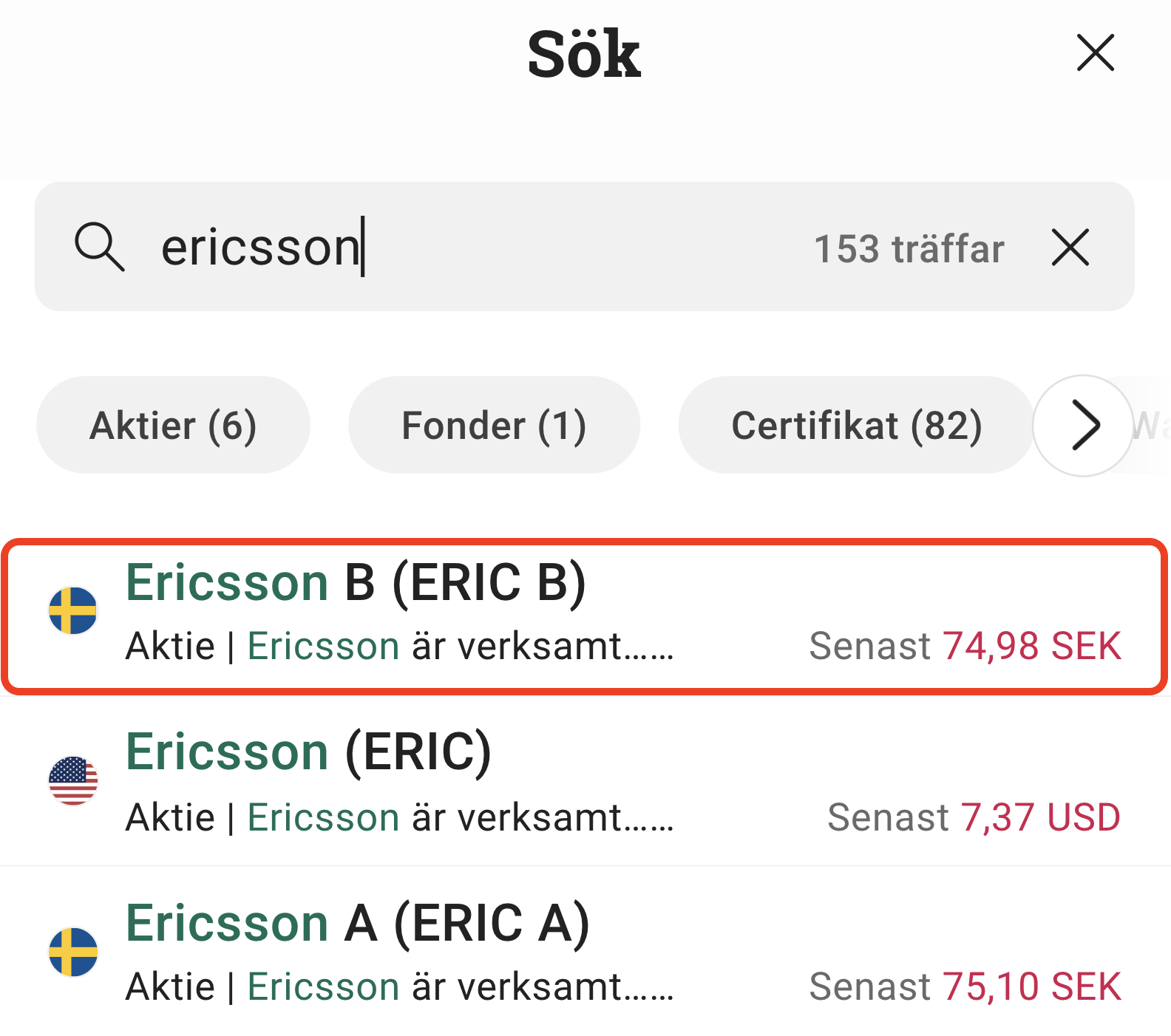 4. Sök efter Ericsson aktie