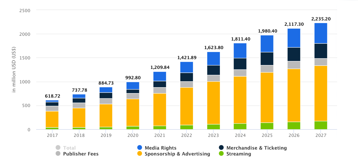 Enligt Statista uppgick de totala intäkterna inom e-sport till ca 1 811 miljoner dollar år 2024. Prognoserna pekar mot att e-sportintäkterna kan växa till ca 2 235 miljoner USD fram till år 2027. Det motsvarar en genomsnittlig tillväxttakt på ca 7.26 % per år.