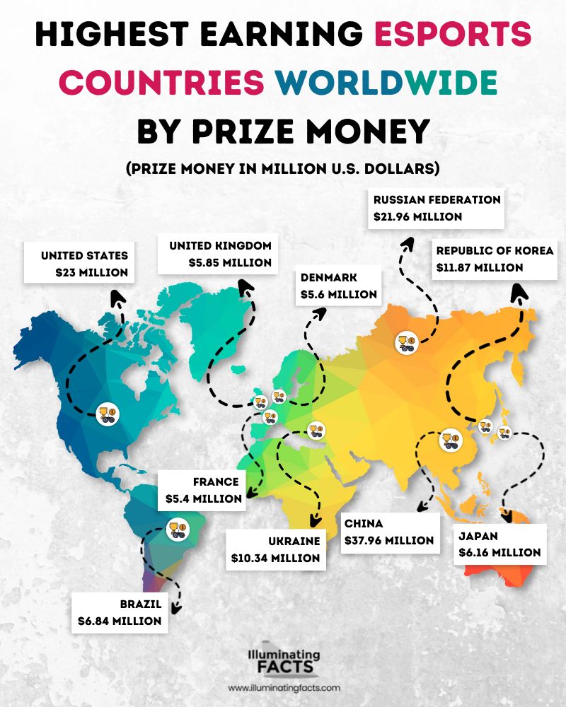 På andra plats hittar vi USA på 23 miljoner dollar, följt av Sydkorea på 11,87 miljoner dollar. Längre ner i listan hittar vi även Japan. Ett tydligt bevis på att e-sport är stort i asiatiska länder.