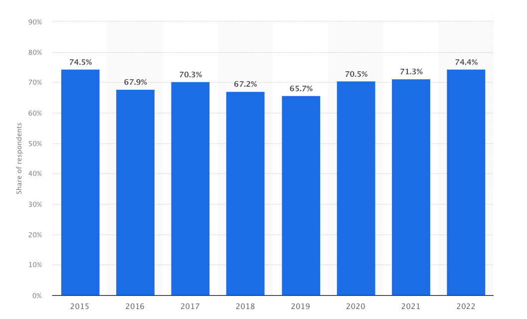 I grafen nedan ser du utvecklingen av studien mellan åren 2015 och 2022. Vi ser att siffran stod högst år 2015. Därefter ser vi att antalet sydkoreaner som spelar spel dalade, till att börja stiga igen efter 2019. Siffrorna har återigen börjat sjunka och uppgick till 65 % år 2024.