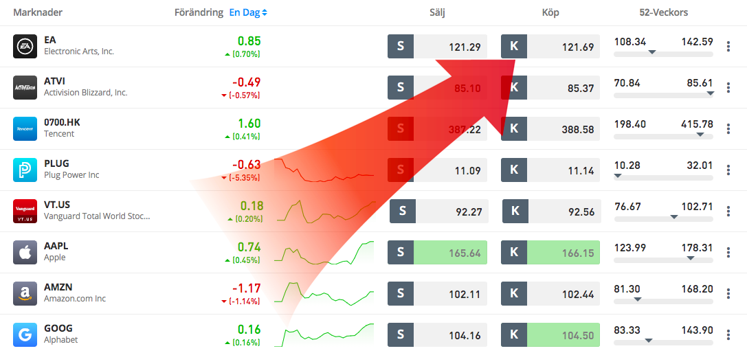 När du har pengar på ditt konto kan du välja en e-sport aktie. I detta exempel väljer vi att köpa aktier i Electronic Arts (EA) genom att klicka på köpknappen.