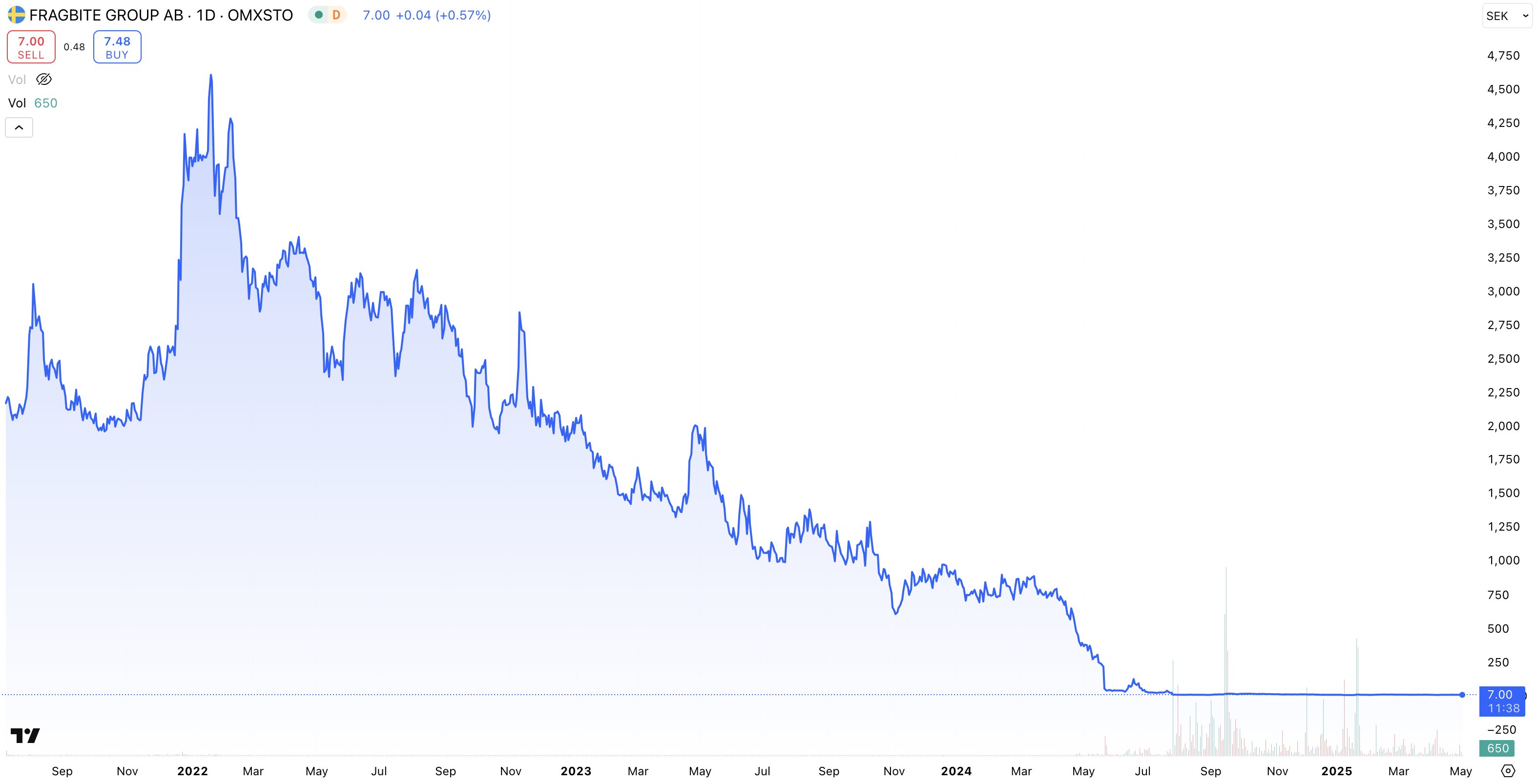 | 11 | Fragbite Group | – 99 %** | Spelutveckling |