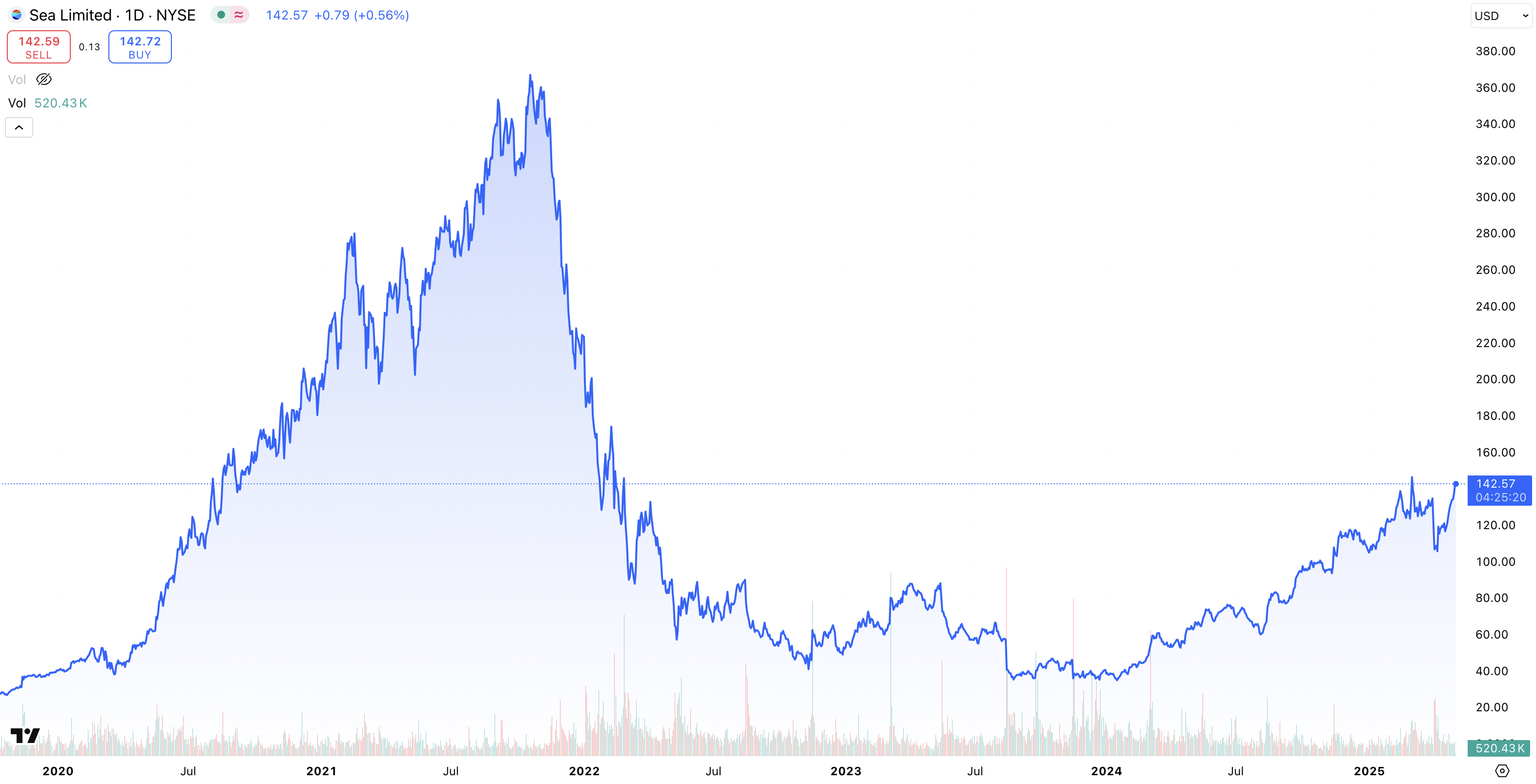 | 2 | Sea Limited | + 158 % | Spelutveckling / arrangör |