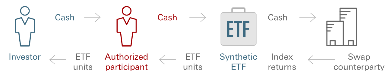 Exempel: Föreställ dig att en syntetisk ETF följer indexet S&P 500 (500 största bolagen i USA). Istället för att köpa alla aktierna tillhörande indexet köper ETF-utställaren endast ett fåtal av dem. För resterande aktier utformas ett swap-kontrakt med en motpart.
