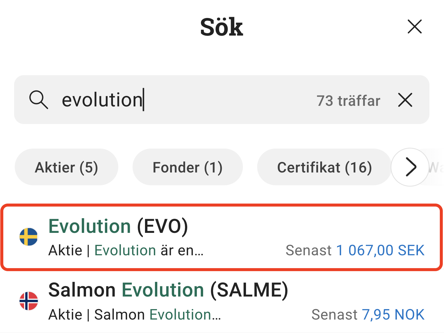 4. Sök efter Evolution aktie