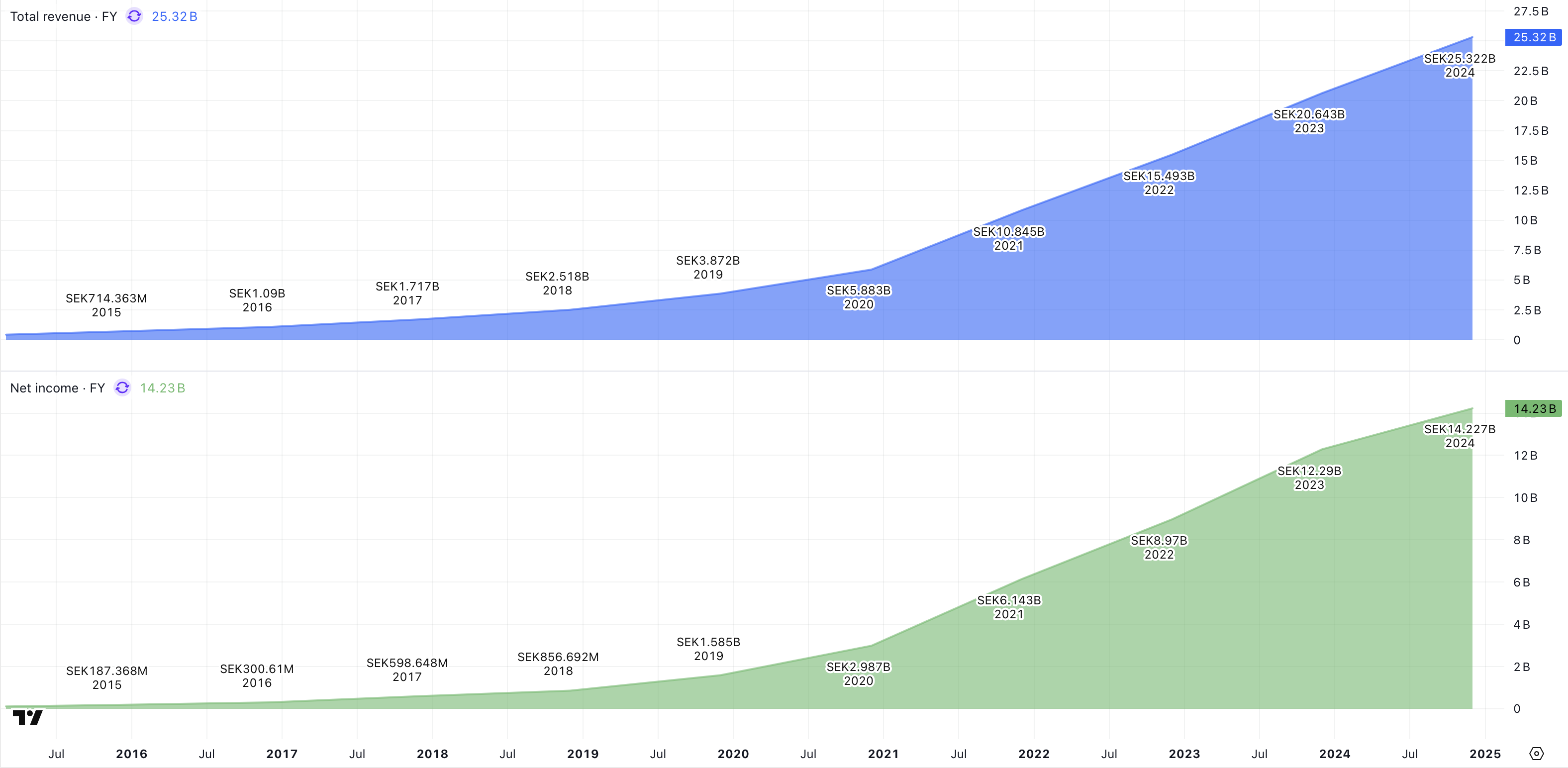 Vinsten har vuxit från 187 miljoner kronor till drygt 14 miljarder kronor. Det är lika med en ackumulerad genomsnittlig avkastning på 62 % per år. Den högre tillväxttakten i vinsten är ett bevis på Evolutions skalbara affärsmodell.