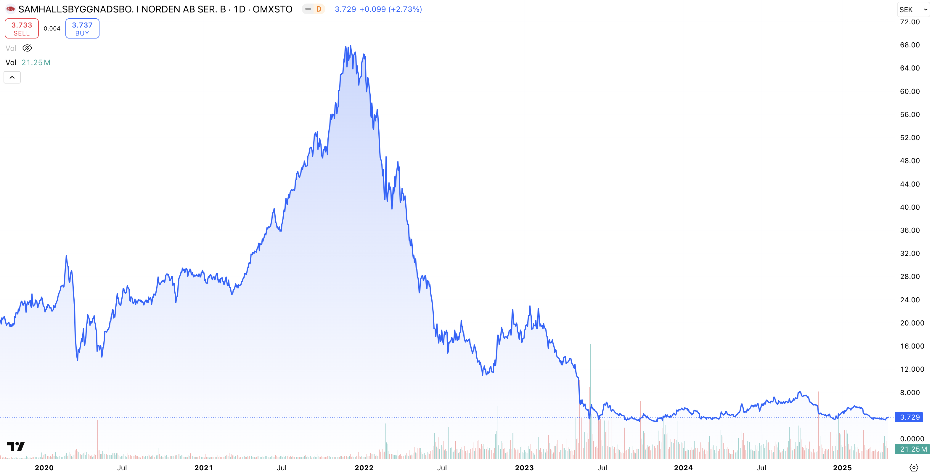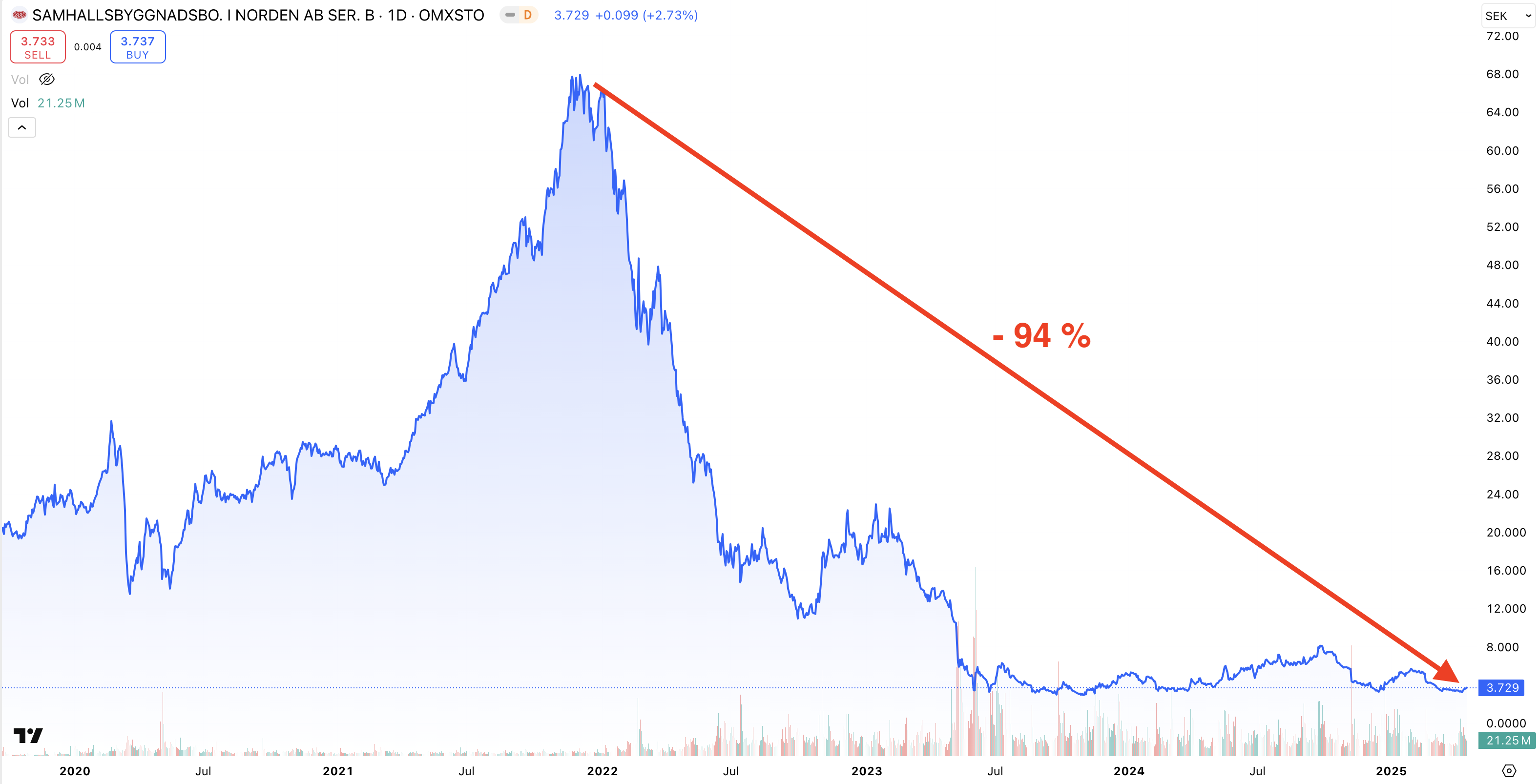 Exempel: Samhällsfastigheter, tillsammans med reglerade hyresrätter, utgör 98 % av SBB:s (Samhällsbyggnadsbolaget i Norden) intäkter. De höjda räntorna år 2022 slog hårt mot SBBs intäkter. Det ledde till att bolagets aktiekrus sjönk kraftigt på kort sikt. Styrräntan har sjunkit sedan toppen på 4 %. Den är dock fortsatt klart högre än innan Riksbanken började höja den.