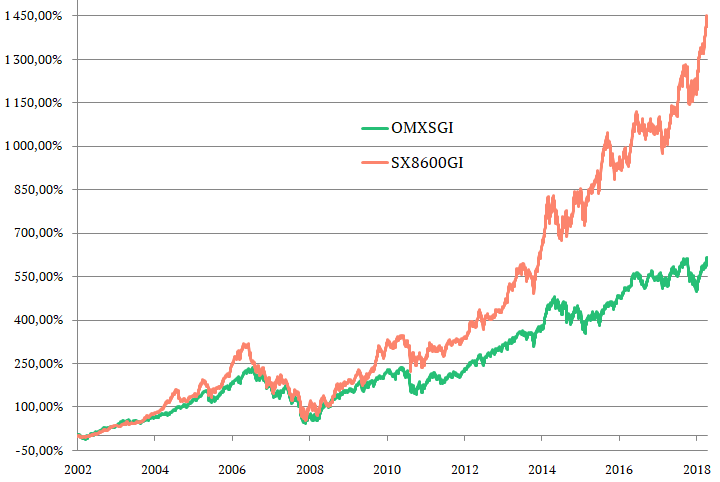 Titta bara grafen nedan hur fastighetsindexet “SX8600GI”, som följer utvecklingen för fastighetsbolagen på Stockholmsbörsen, presterat mot Stockholmsbörsen på lång sikt.