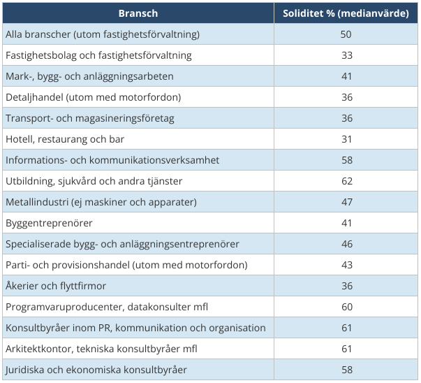 SCB har gjort en analys över medianvärdet för olika branschers soliditet. Soliditet är ett nyckeltal som används för att visa hur stor andel av ett företags totala tillgångar som finansieras med eget kapital. Ju högre denna siffra är, desto större andel tillgångar finansieras med eget kapital.