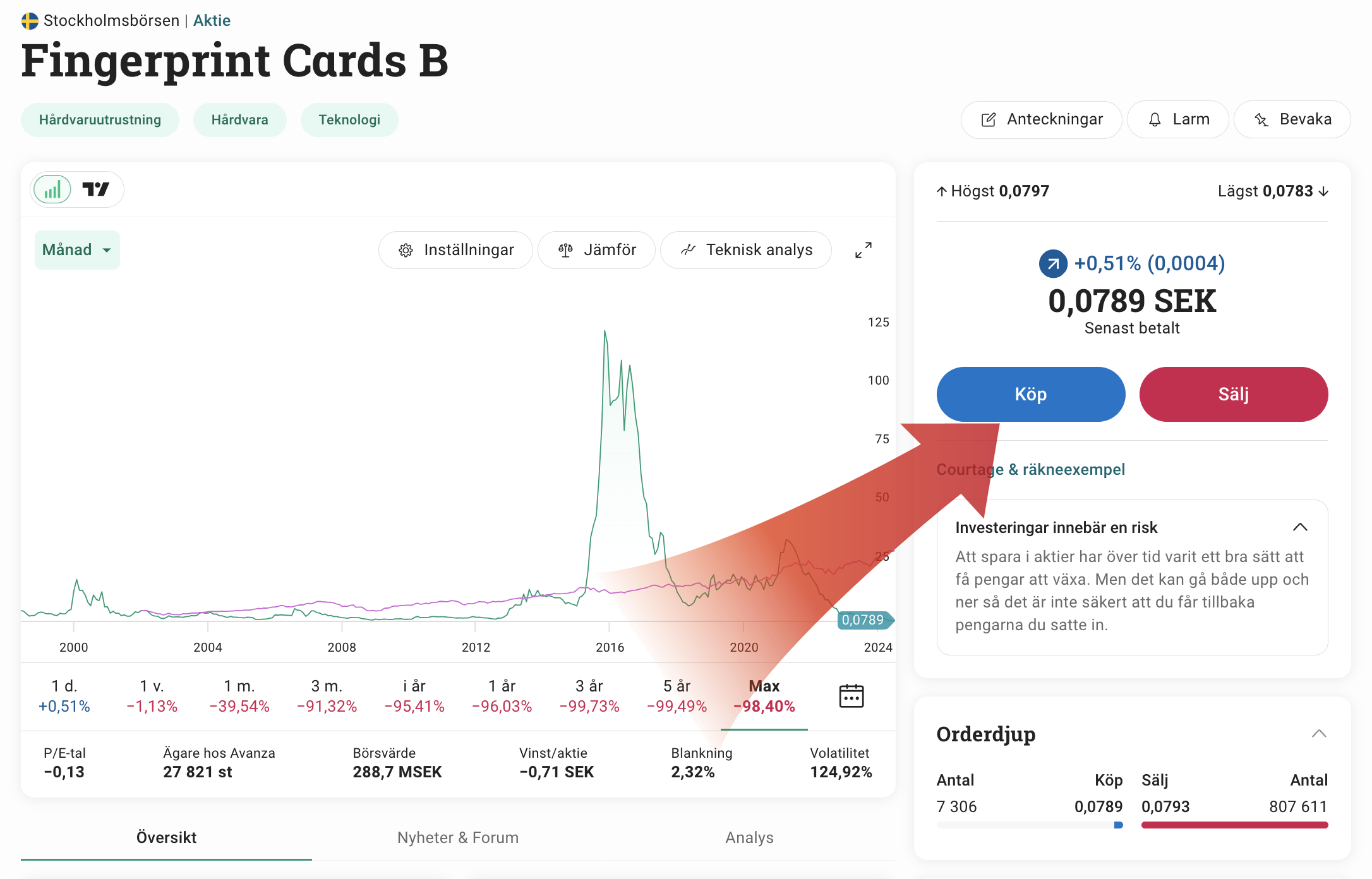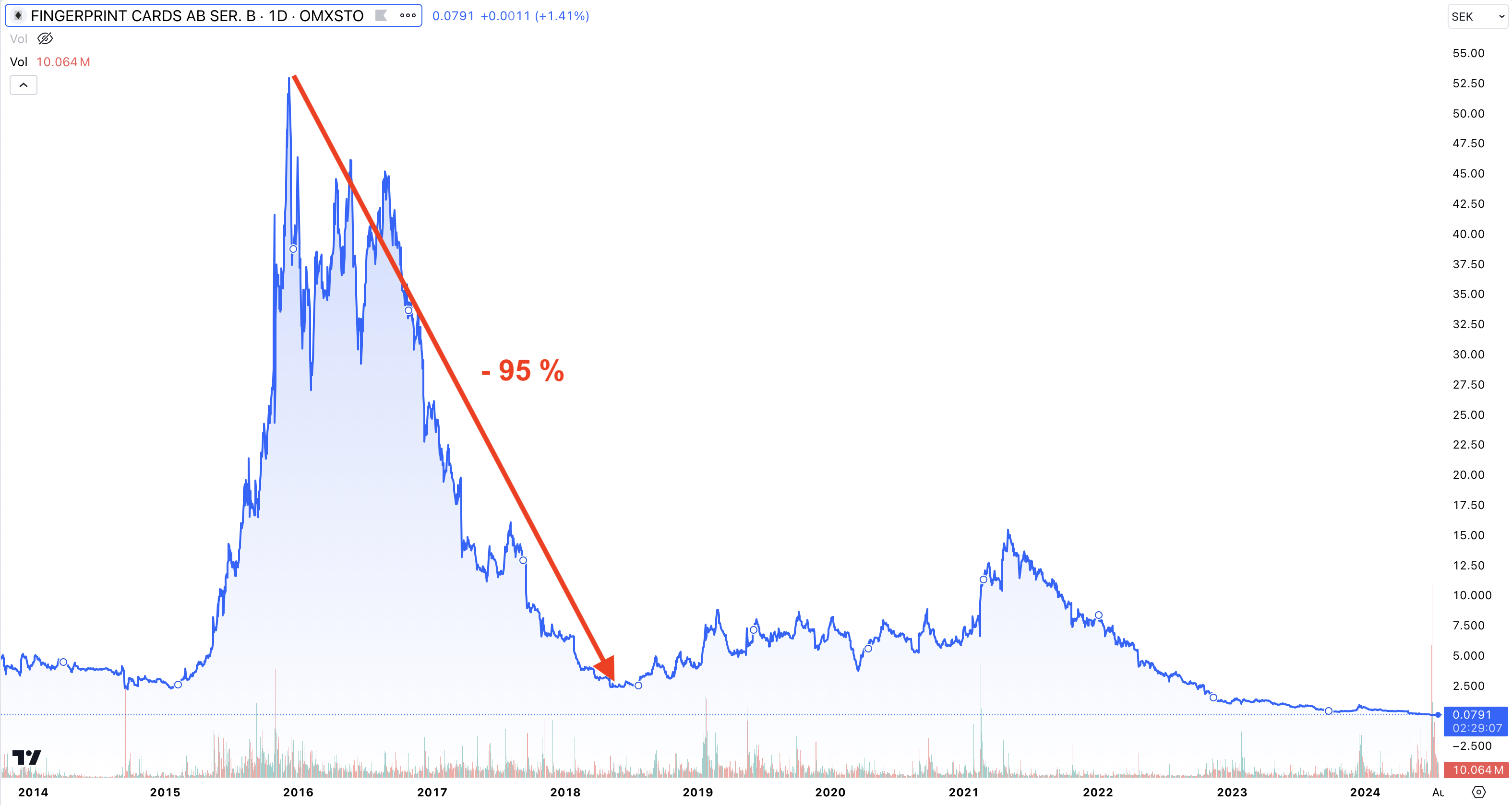 Som mest var Fingerprint aktie värd omkring 136 kr per aktie år 2015. Den har sedan dess sjunkit och aldrig mer kommit upp till samma värdering.