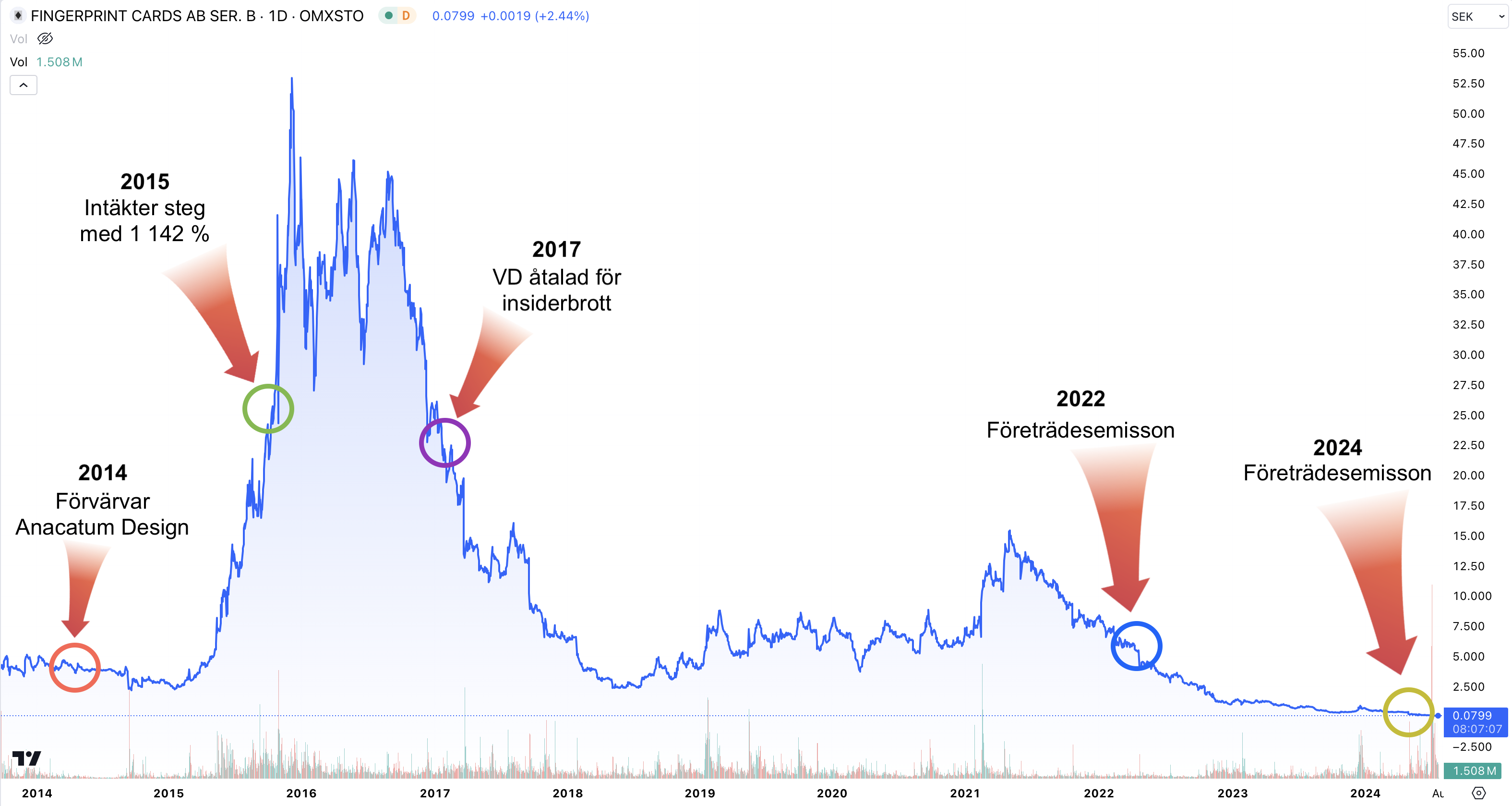 En gång i tiden (år 2015/2016) var Fingerprint Cards den bäst presterande aktien på Stockholmsbörsen. År 2017 blev dock bolagets fd. VD, Johan Carlström, åtalad för grovt insiderbrott. Med tiden ökade även konkurrensen, från bl.a. Apple. En rad dåliga nyheter ledde till att bolagets aktie rasade på börsen efter att ha nått ett ATH (all time high) på ca 136 kr, år 2015.