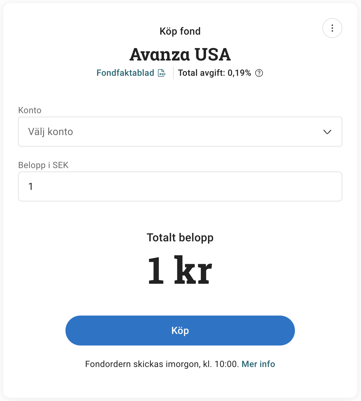 Exempel: Nedan visas en skärmdump från Avanza. Den visar en köporder gör fonden ”Avanza USA”. Som det går att se i bilden är det minska köpbeloppet endast 1 kr.