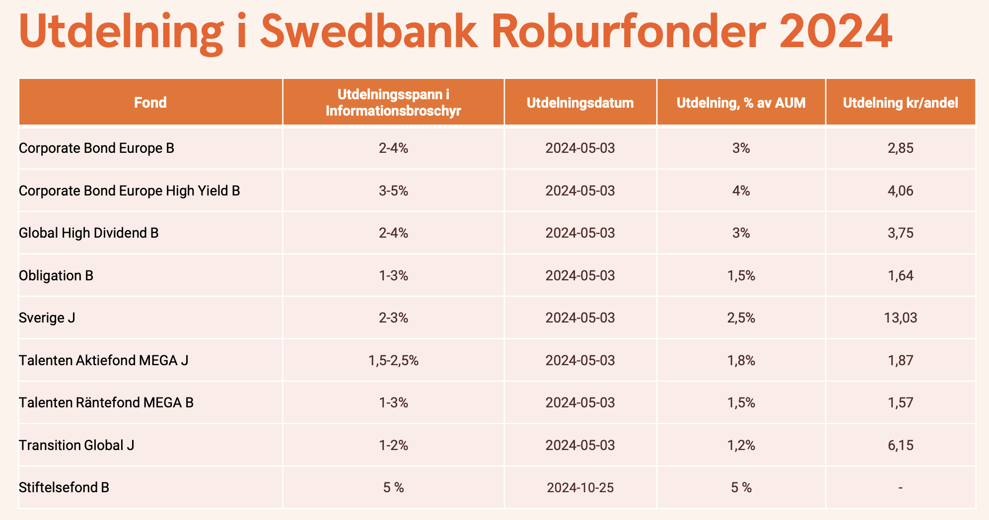Tabellen nedan är tagen från Swedbank. Den visar datum då bankens utdelningsfonder genomförde utdelning till fondägare. Alla förutom en fond gav utdelning under maj månad. Endast en gav utdelning i oktober.