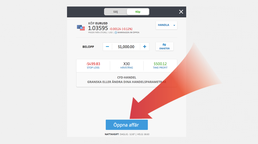 Exempel: Föreställ dig att du vill handla EUR/USD till ett värde av 100 000 USD med hävstång 1:100. Det betyder att du endast behöver satsa 1 000 USD av eget kapital. Resterande del lånas automatiskt när en position öppnas. Detta med ditt eget kapital som säkerhet.