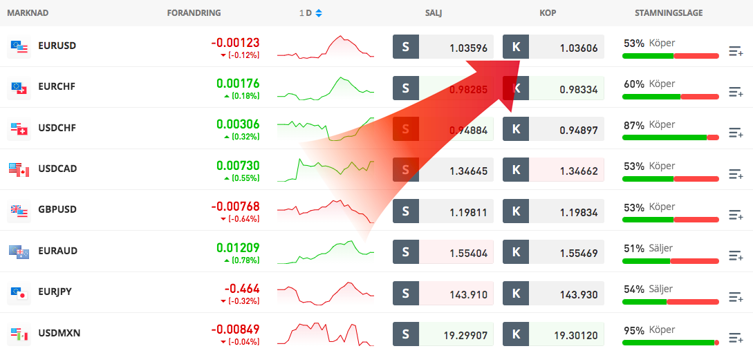Det är från spreaden som valutamäklare, utan courtageavgifter, tjänar sina pengar. Istället för att erbjuda en separat kostnad i form av en courtageavgift, är kostnaden istället inbyggd i köp- och säljpriset i det valutapar du vill handla.