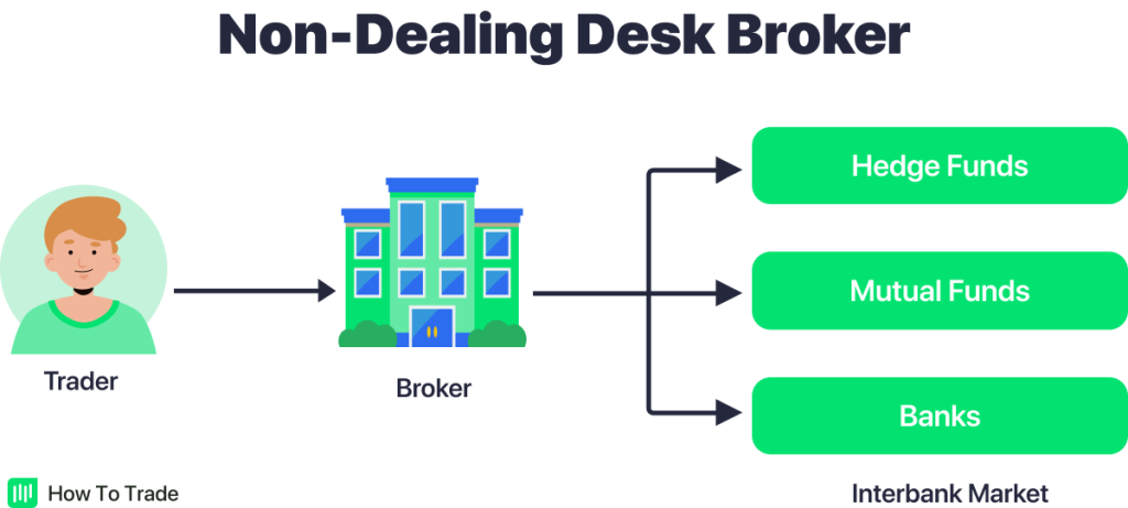 NDD (Non-Dealing Desk Brokers), även kallat “Direct Market Access”, är mäklare som erbjuder dig direkt åtkomst till den internationella valutamarknaden. Med direkt åtkomst menas att mäklaren inte tar några positioner mot sina kunder, som hos en “dealing desk broker”. Istället sker all handel direkt på marknaden.