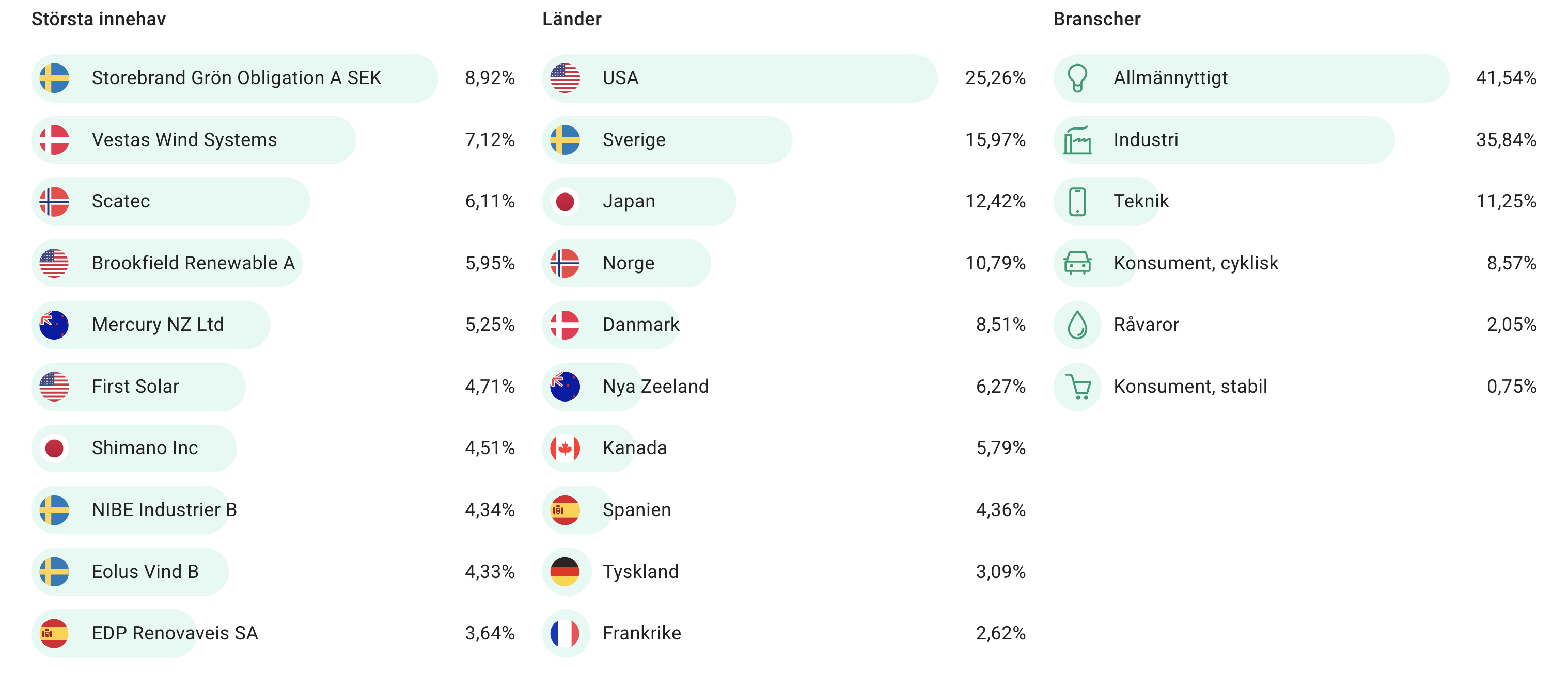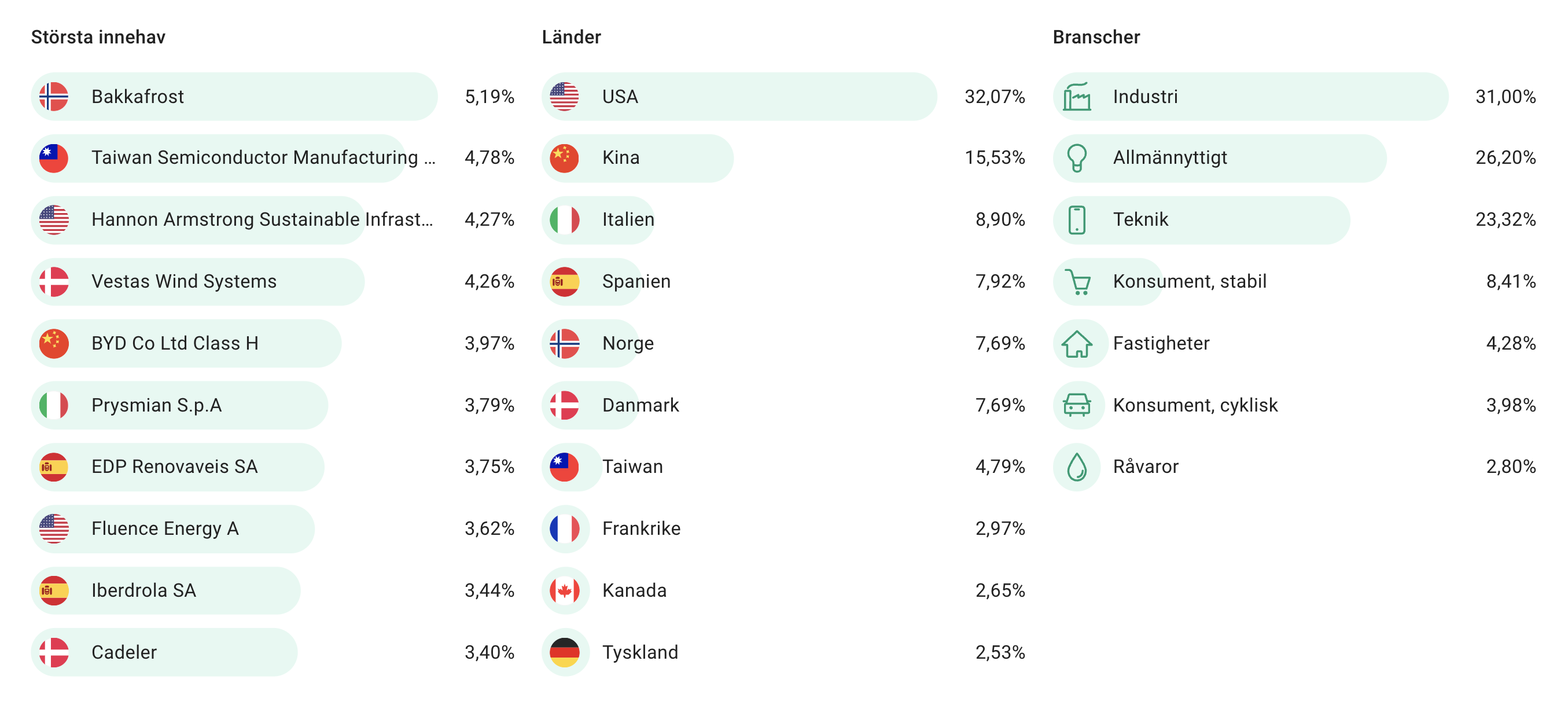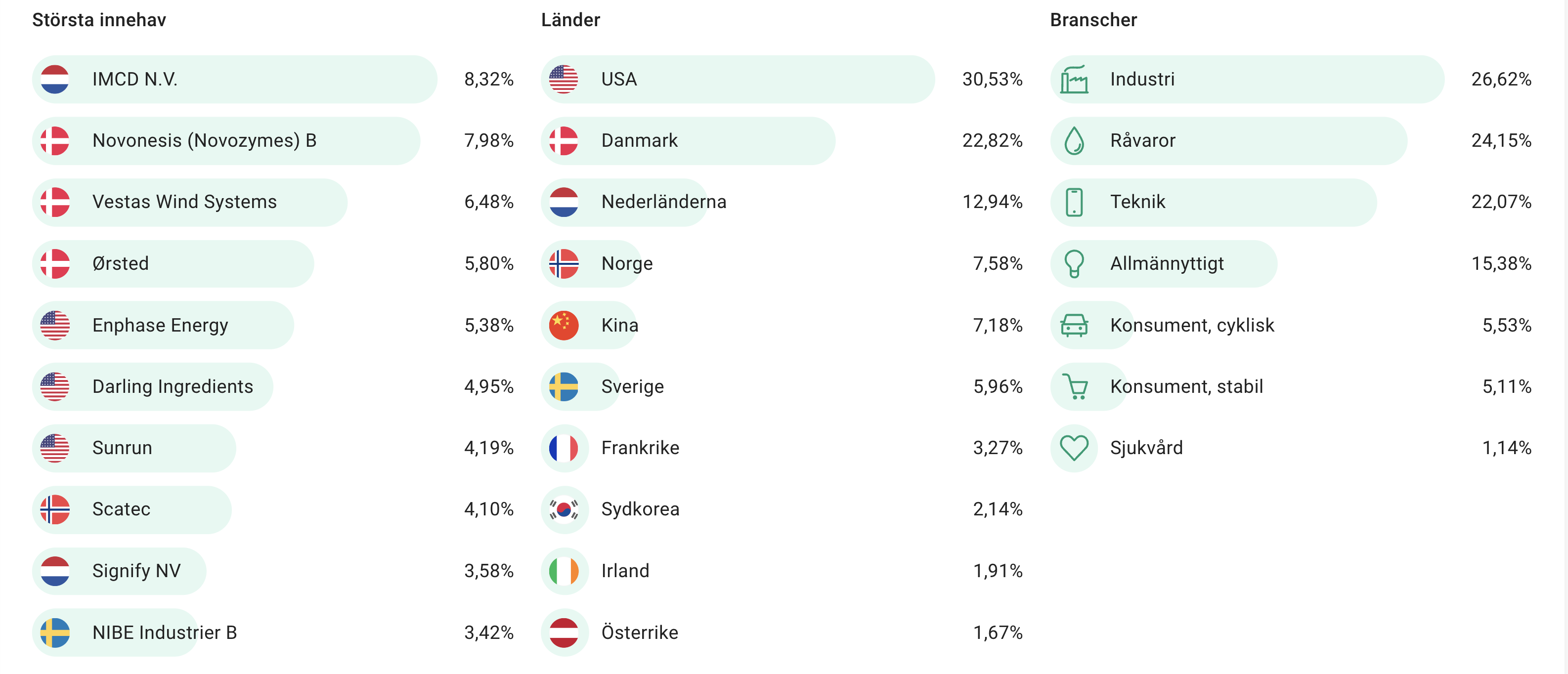 Största innehavet bestod av aktier i det nederländska bolaget IMCD N.V. och Novonesis, vilka är verksamma inom kemisektorn. Vidare utgjorde Vestas Wind Systems och Ørsted en betydande andel av den totala fondportföljen, vilka är verksamma inom vindkraftssegmentet.